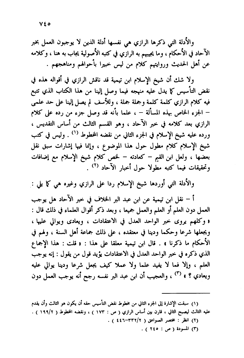 ولاشك أن شيخ الإسلام ابن تيمية قد ناقش الرازي في أقواله هذه في نقض التأسيس كما يدل عليه منهجه فيما وصل إلينا من هذا الكتاب الذي تتبع في كلام الرازي كلمة كلمة وجملة جملة، وللأسف لم يصل إلينا على حد علمي- الجزء الخاص بهذه المسألة-، علما بأنه قد وصل جزء من رده على كلام الرازي بعد كلامه في خبر الآحاد، وهو القسم الثالث من أساس التقديس، ورد عليه شيخ الإسلام في الجزء الثاني من نقضه المخطوط (¬1) . وليس في كتب شيخ الإسلام كلام مطول حول هذا الموضوع، وإنما فيها إشارات سبق نقل بعضها، ولعل ابن القيم- كعادتهـ لخص كلام شيخ الإسلام مع إضافات وتحقيقات فيما كتبه مطولا حول أخبار الآحاد (¬2) .