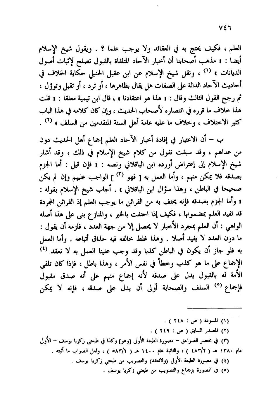 ب- أن الاعتبار في إفادة أخبار الآحاد العلم إجماع أهل الحديث دون من عداهم، وقد سبقت نقول من كلام شيخ الإسلام في ذلك، وقد أشار شيخ الإسلام إلى إعتراض أوردة ابن الباقلاني ونصه: " فإن قيل: أما الجزم بصدقة فلا يمكن منهم، وأما العمل به [فهو (¬3) ] الواجب عليهم وإن لم يكن صحيحا في الباطن، وهذا سؤال ابن الباقلاني ". أجاب شيخ الإسلام بقوله: " وأما الجزم بصدقه فإنه يحتف به من القرائن ما يوجب العلم إذ القرائن المجردة قد تفيد العلم بمضمونها، فكيف إذا احتفت بالخبر، والمنازع بنى على هذا أصله الواهي: أن العلم بمجرد الأخبار لا يحصل إلا من جهة العدد، فلزمه أن يقول: ما دون العدد لا يفيد أصلا. وهذا غلط خالفه فيه حذاق أتباعه. وأما العمل به فلو جاز أن يكون في الباطن كذبا وقد وجب علينا العمل به لا نعقد (¬4) الإجماع على ما هو كذب وخطأ في نفس الأمر، وهذا باطل، فإذا كان تلقي الأمة له بالقبول يدل على صدقه لأنه إجماع منهم على أنه صدق مقبول فإجماع (¬5) السلف والصحابة أولى أن يدل على صدقه، فإنه لا يمكن