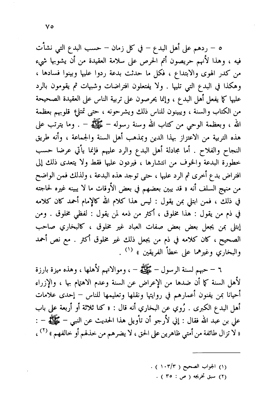 6- حبهم لسنة الرسول - صلى الله عليه وسلم -، وموالاتهم لأهلها، وهذه ميزة بارزة لأهل السنة كما؟ أن ضدها من الإعراض عن السنة وعدم الاهتمام بها، والازراء أحيانا بمن يفنون أعمارهم في روايتها ونقلها وتعليمها للناس- إحدى علامات أهل البدع الكبرى. رُوي عن البخاري أنه قال: " كنا ثلالة أو أربعة على باب علي بن عبد الله فقال: إني لأرجو أن تأويل هذا الحديث عن النبي - صلى الله عليه وسلم -: "لا تزال طائفة من أمتى ظاهرين على الحق، لا يضرهم من خذلهم أو خالفهم" (¬2) ،