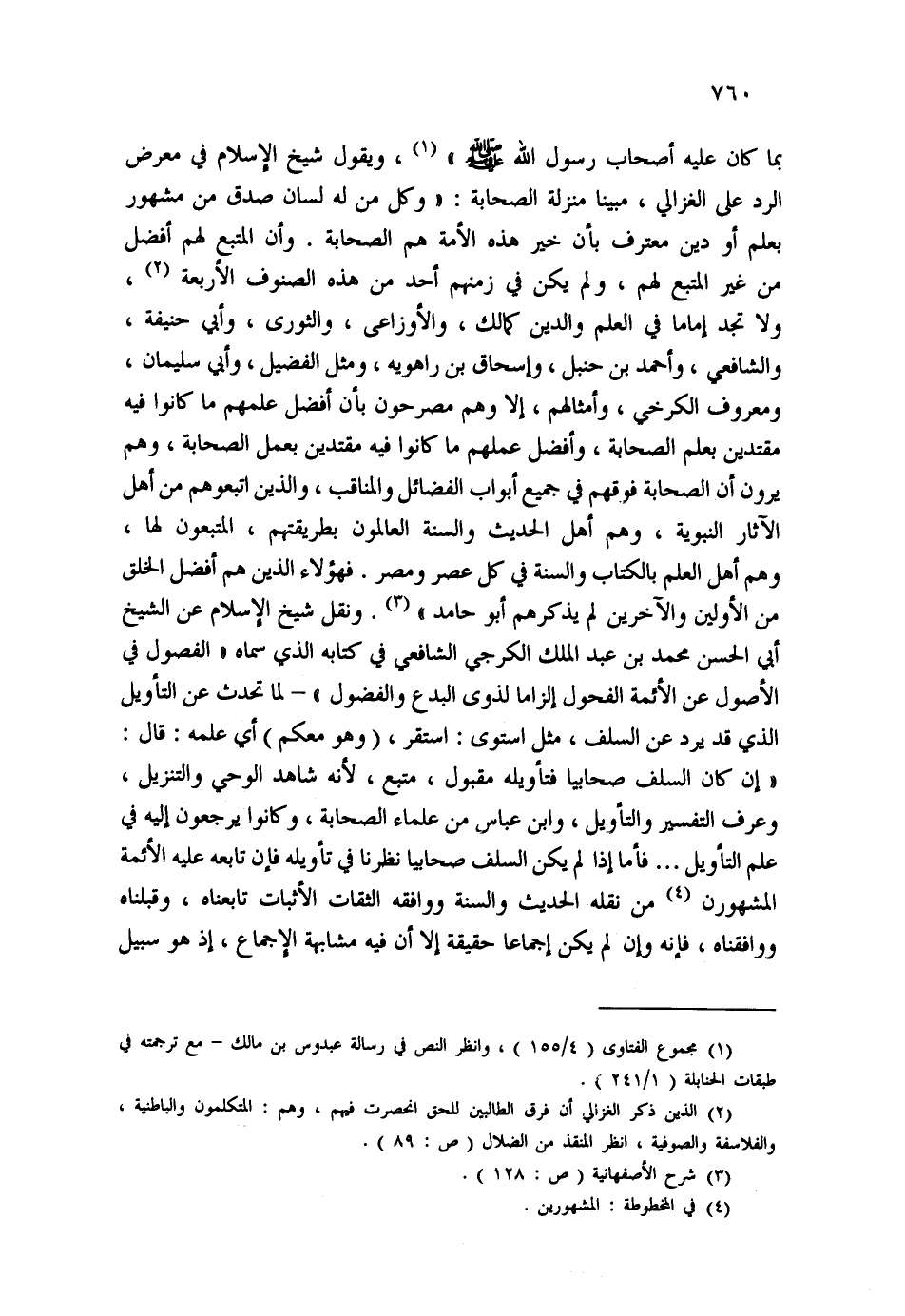 بما كان عليه أصحاب رسول الله - صلى الله عليه وسلم - (¬1) ويقول شيخ الإسلام في معرض الرد على الغزالي، مبيناً منزلة الصحابة: " وكل من له لسان صدق من مشهور بعلم أو دين معترف بأن خير هذه الأمة هم الصحابة، وأن المتبع لهم أفضل من غير المتبع لهم، ولم يكن في زمنهم أحد من هذه الصنوف الأربعة (¬2) ، ولا تجد إماماً في العلم والدين كمالك، والأوزاعي، والثوري، وأبي حنيفة، والشافعي، وأحمد بن حنبل، وإسحاق بن راهوية، ومثل الفضيل، وأبي سليمان، ومعروف الكرخي، وأمثالهم، إلا وهم مصرحون بأن أفضل علمهم ما كانوا فيه مقتدي بعلم الصحابة، وأفضل عملهم ما كانوا فيه مقتدين بعمل الصحابة، وهم يرون أن الصحابة فوقهم في جميع أبواب الفضائل والمناقب، والذين اتبعوهم من أهل الآثار النبوية، وهم أهل الحديث والسنة العالمون بطريقتهم، المتبعون لها، وهم أهل العلم بالكتاب والسنة في كل عصر، فهؤلاء الذين هم أفضل الخلق من الأولين والآخرين لم يذكرهم أبو حامد " (¬3) .