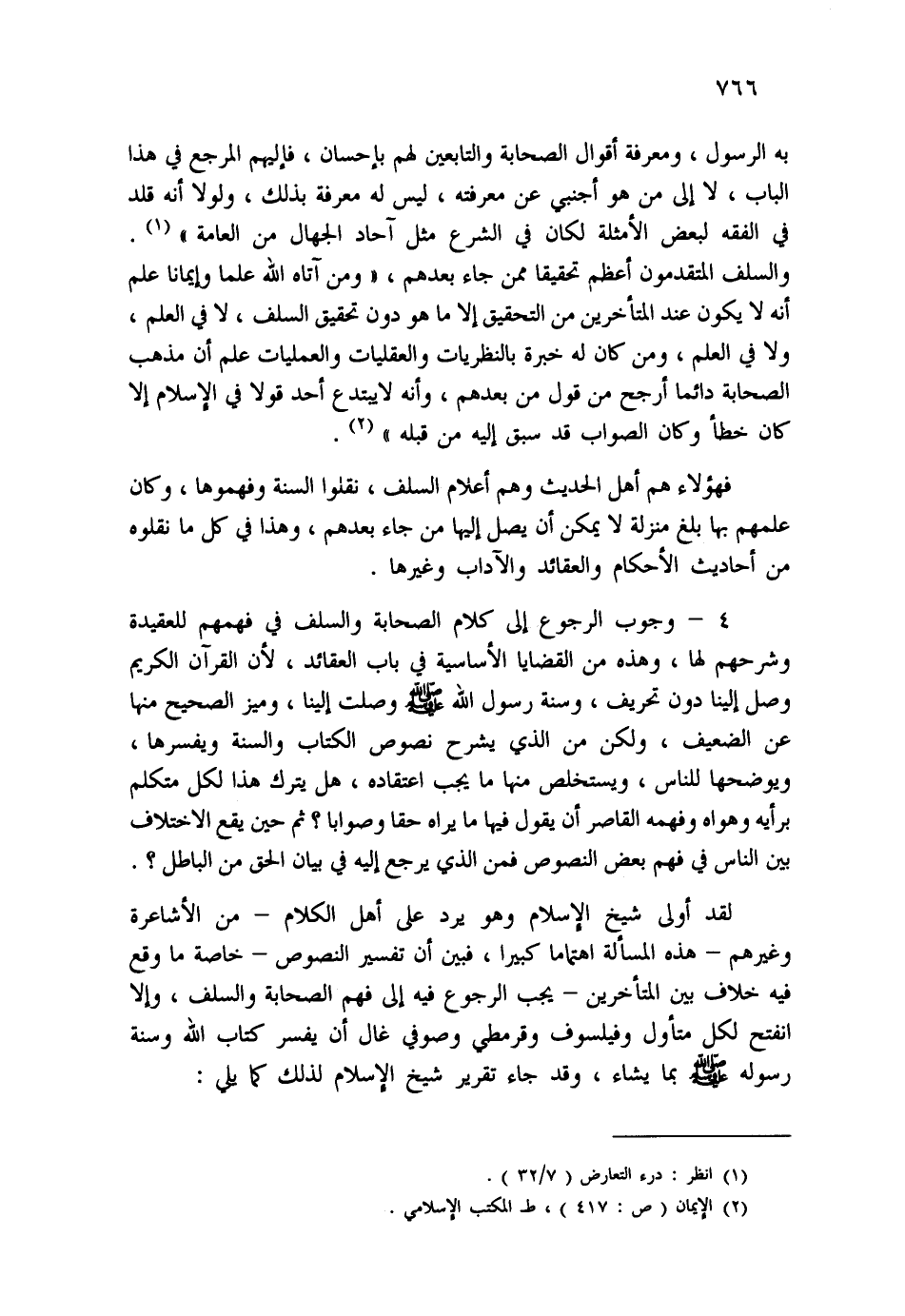 4- وجوب الرجوع إلى كلام الصحابة والسلف في فهمهم للعقيدة وشرحهم لها، وهذه من القضايا الأساسية في باب العقائد، لأن القرآن الكريم وصل إلينا دون تحريف، وسنة رسول الله - صلى الله عليه وسلم - وصلت إلينا، وميز الصحيح منها عن الضعيف، ولكن من الذي يشرح نصوص الكتاب والسنة ويفسرها، ويوضحها للناس، ويستخلص منها ما يجب اعتقاده، هل يترك هذا لكل متكلم برأيه وهواه وفهمه القاصر أن يقول فيها ما يراه حقاً وصواباً؟ ثم حين يقع الاختلاف بين الناس في فهم بعض النصوص فمن الذي يرجع إليه في بيان الحق من الباطل؟.