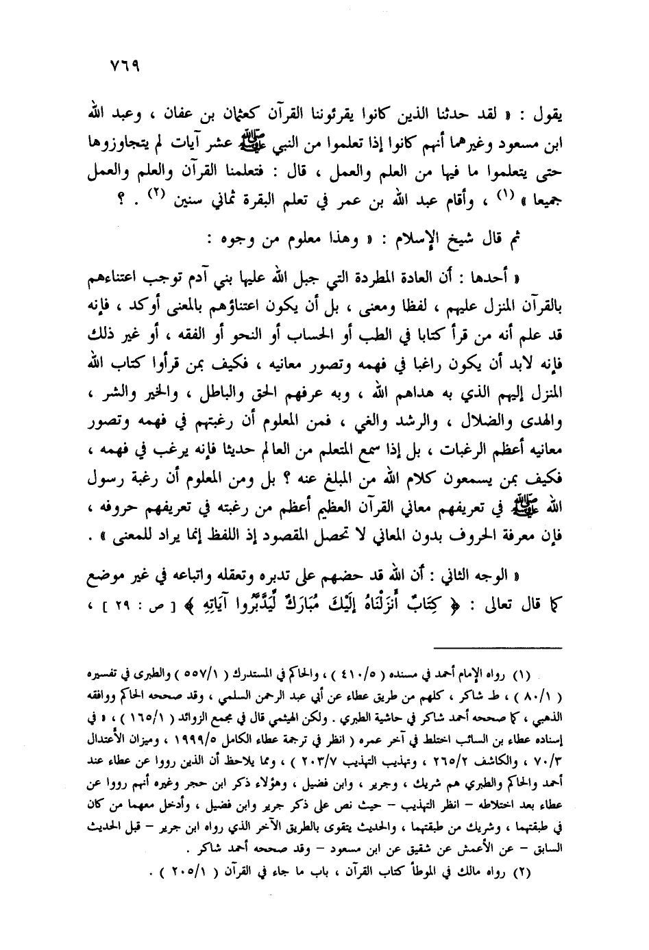 (¬1) رواه الإمام أحمد في مسنده (5/410) ، والحاكم في المستدرك (1/557) ، والطبري في تفسيره (1/80) ، ط شاكر، كلهم من طريق عطاء عن أبي عبد الرحمن السلمي، وقد صححه الحاكم ووافقه الذهبي، كما صححه أحمد شاكر في حاشية الطبري، ولكن الهيثمي قال في مجمع الزوائد (1/165) ،: " في إسناده عطاء بن السائب اختلط في آخر عمره (انظر في ترجمة عطاء الكامل 5/1999، وميزان الاعتدال 3/70، والكاشف 2/265، وتهذيب التهذيب 7/203) ، ومما يلاحظ أن الذين رووا عن عطاء عند أحمد والحاكم والطبري هم شريك، وجرير، وابن فضيل، وهؤلاء ذكر ابن حجر وغيره أنخم رووا عن عطاء بعد اختلاطه - انظر التهذيب - حيث نص على ذكر جرير وابن فضيل، وأدخل معهما من كان في طبقتهما، وشريك من طبقتهما، والحديث يتقوى بالطريق الآخر الذي رواه ابن جرير، قبل الحديث السابق - عن الأعمش عن شقيق عن ابن سعود - وقد صححه أحمد شاكر.