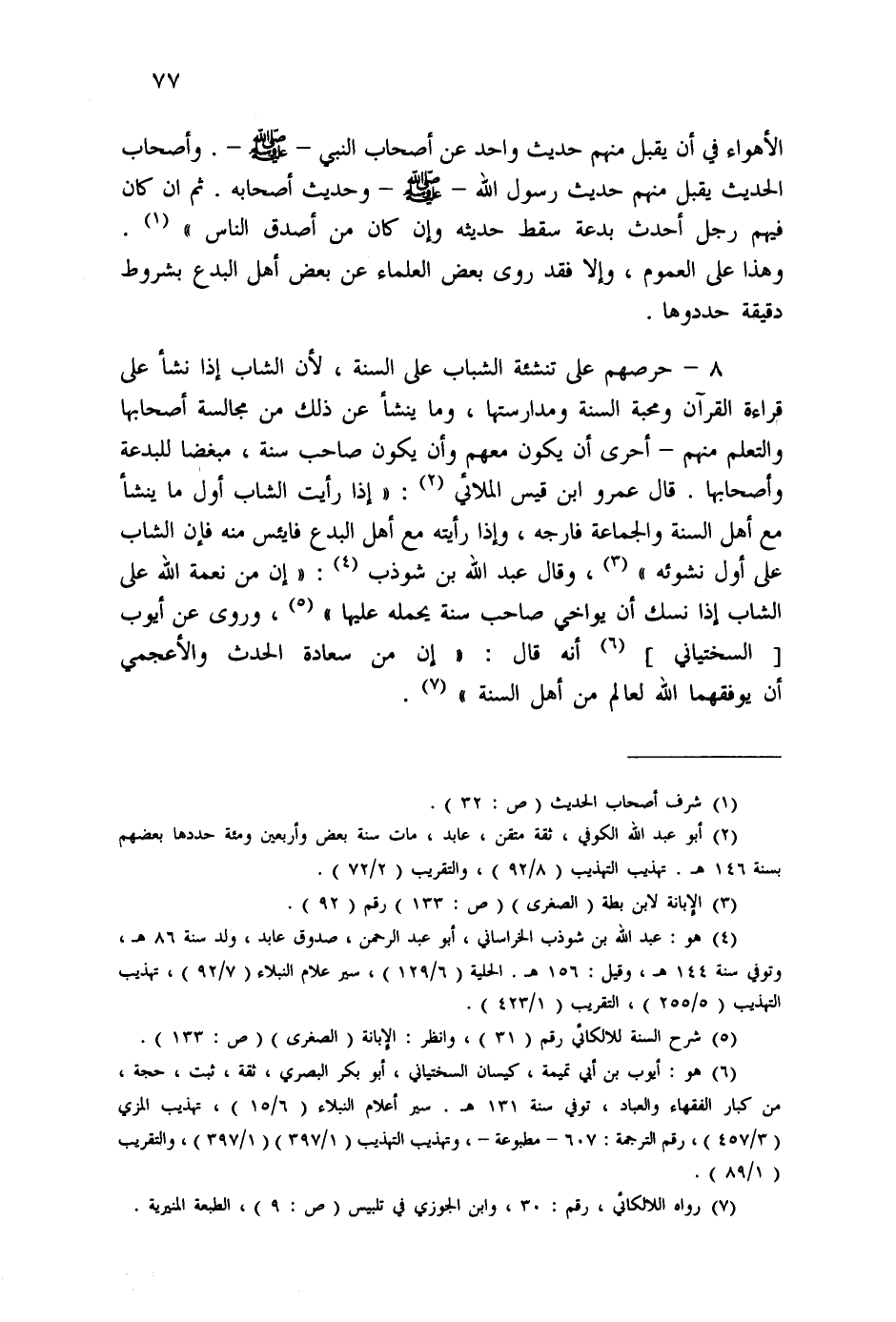 8- حرصهم على تنشئة الشباب على السنة، لأن الشاب إذا نشأ على قراءة القرآن ومحبة السنة ومدارستها، وما ينشأ عن ذلك من مجالسة أصحابها والتعلم منهم- أحرى أن يكون معهم وأن يكون صاحب سنة، مبغضا للبدعة وأصحابها. قال عمرو ابن قيس الملائي (¬2) : " إذا رأيت الشاب أول ما ينشأ مع أهل السنة والجماعة فارجه، وإذا رأيته مع أهل البدع فايئس منه فإن الشاب على أول نشوئه " (¬3) ، وقال عبد الله بن شوذب (¬4) : " إن من نعمة الله على الشاب إذا نسك أن يواخي صاحب سنة يحمله عليها " (¬5) ، وروى عن أيوب [السختياني] (¬6) أنه قال: " إن من سعادة الحدث والأعجمى أن يوفقهما الله لعالم من أهل السنة " (¬7) .