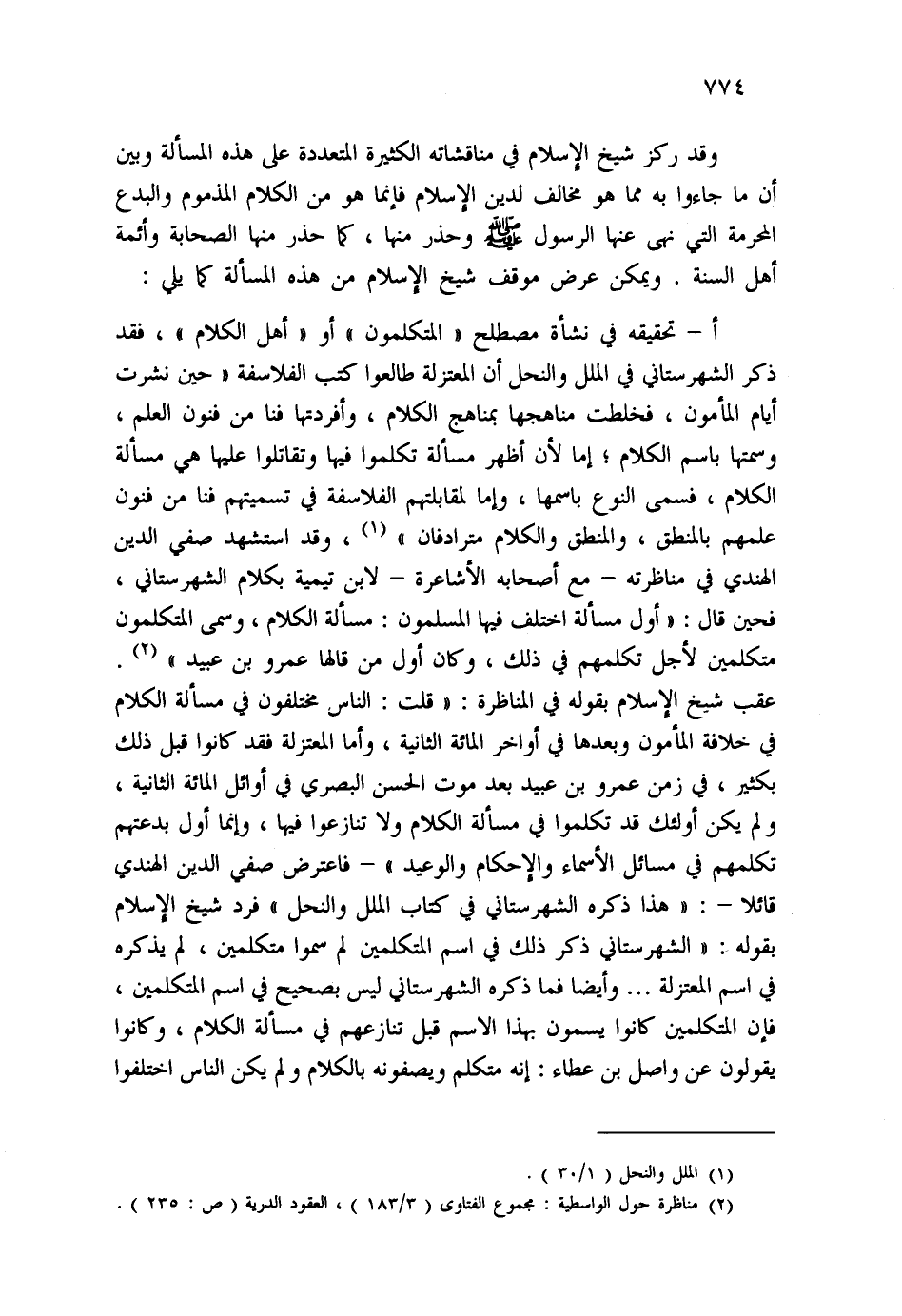 أ - تحقيقه في نشأة مصطلح " المتكلمون " أو " أهل الكلام " فقد ذكر الشهرستاني في الملل والنحل أن المعتزلة طالعوا كتب الفلاسفة " حين نشرت أيام المأمون، فخلطت مناهجها بمناهج الكلام، وأفردتها فناً من فنون العلم، وسمتها باسم الكلام؛ إما لأن أظهر مسألة تكلموا فيها وتقاتلوا عليها هي مسألة الكلام، فسمي هذا النوع باسمها، وإما لمقابلتهم الفلاسفة في تسميتهم فناً من فنون علمهم بالمنطق، والمنطق والكلام مترادفان" (¬1) ،وقد استشهد صفي الدين الهندي في مناظرته - مع أصحابه الأشاعرة - لابن تيمية بكلام الشهرستاني، فحين قال: " أول مسألة اختلف فيها المسلمون: مسألة الكلام، وسمي المتكلمون متكلمين لأجل تكلمهم في ذلك، وكان أول من قالها عمرو بن عبيد" (¬2) .