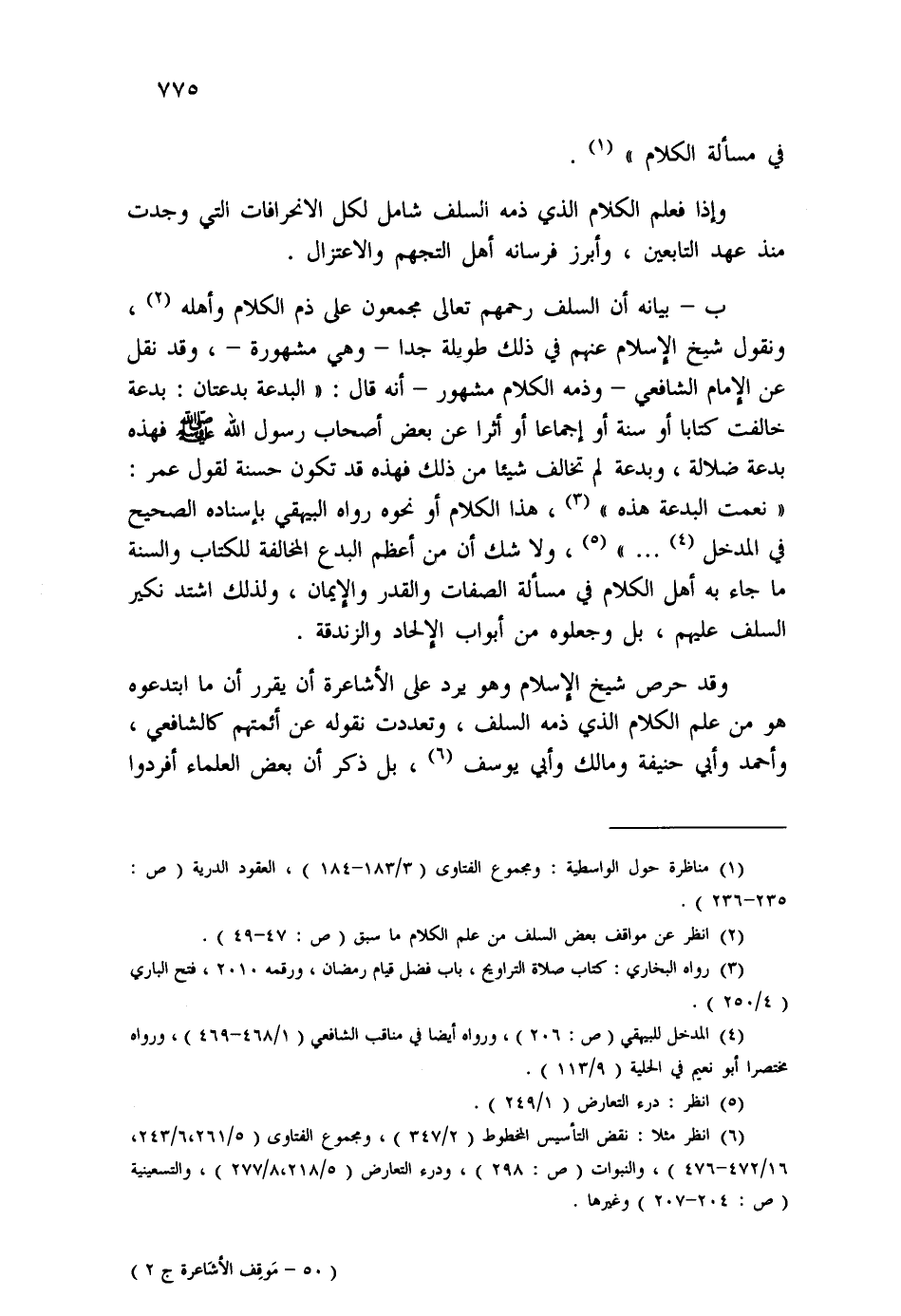 ب - بيانه أن السلف رحمهم الله تعالى مجمعون على ذم الكلام وأهله (¬2) ، ويقول شيخ الإسلام عنهم في ذلك طويلة جداً - وهي مشهورة - وقد نقل عن الإمام الشافعي -وذمه الكلام مشهور - أنه قال: " البدعة بدعتان: بدعة خالفت كتاباً أو سنة أو إجماعاً أو أثراً عن بعض أصحاب رسول الله - صلى الله عليه وسلم - فهذه بدعة ضلالة، وبدعة لم تخالف شيئاً من ذلك فهذه قد تكون حسنة لقول عمر: " نعمت البدعة هذه " (¬3) ، هذا الكلام أو نحوه رواه البيهقي بإسناده الصحيح في المدخل (¬4) .. " (¬5) ، ولا شك أن من أعظم البدع المخالفة للكتاب والسنة ما جاء به أهل الكلام في مسألة الصفات والقدر والإيمان، ولذلك اشتد نكير السلف عليهم، بل وجعلوه من أبواب الإلحاد والزندقة.