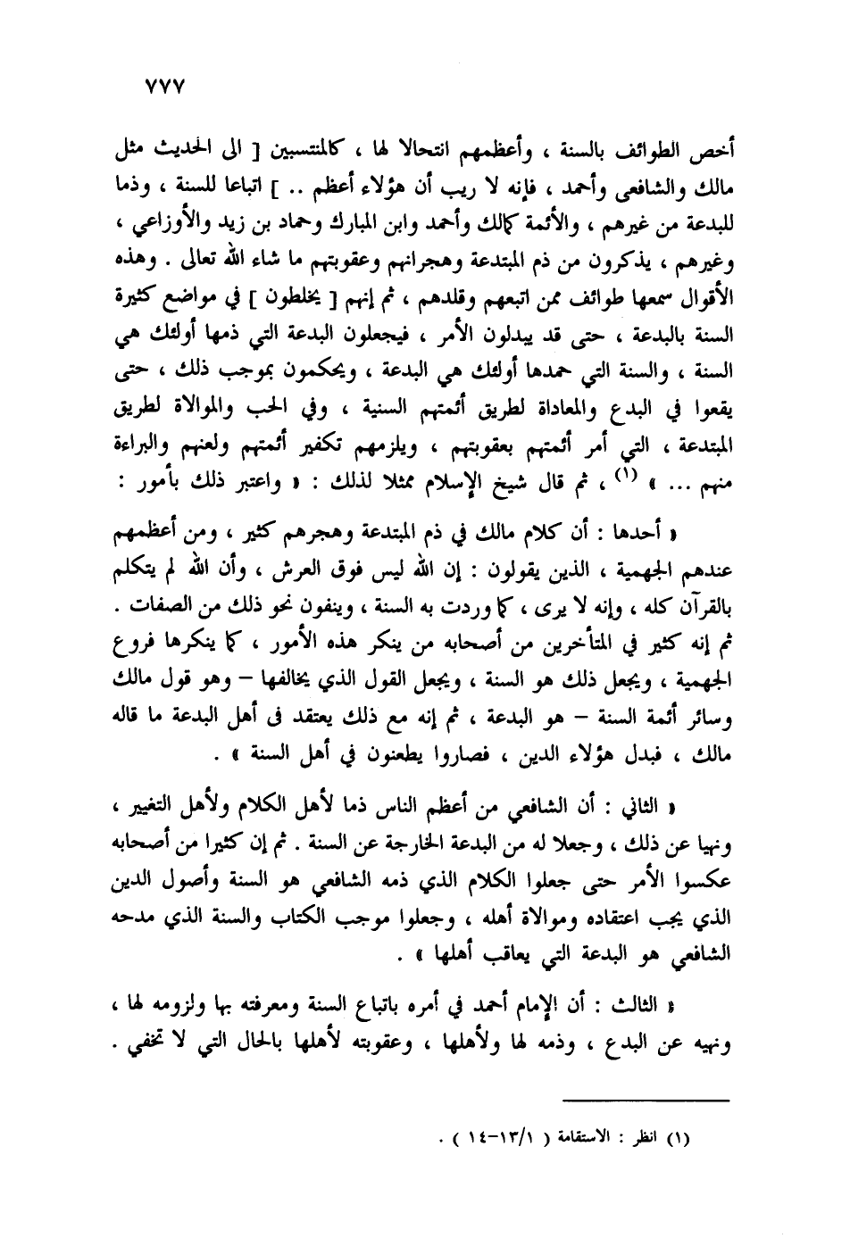 أحدهما: أن كلام مالك في ذم المبتدعة وهجرهم كثير، ومن أعظمهم عندهم الجهمية، الذين يقولون: إن الله ليس فوق العرش، وأن الله لم يتكلم بالقرآن كله، وإنه لا يرى، كما وردت به السنة، وينفون نحو ذلك من الصفات. ثم إنه كثير في المتأخرين من أصحابه من ينكر هذه الأمور، كما ينكرها فروع الجهمية، ويجعل ذلك هو السنة، ويجعل القول الذي يخالفها - وهو قول مالك وسائر أئمة السنة - هو البدعة، ثم إنه مع ذلك يعتقد في أهل البدعة ما قاله مالك، فبدل هؤلاء الدين، فصاروا يطعنون في أهل السنة".