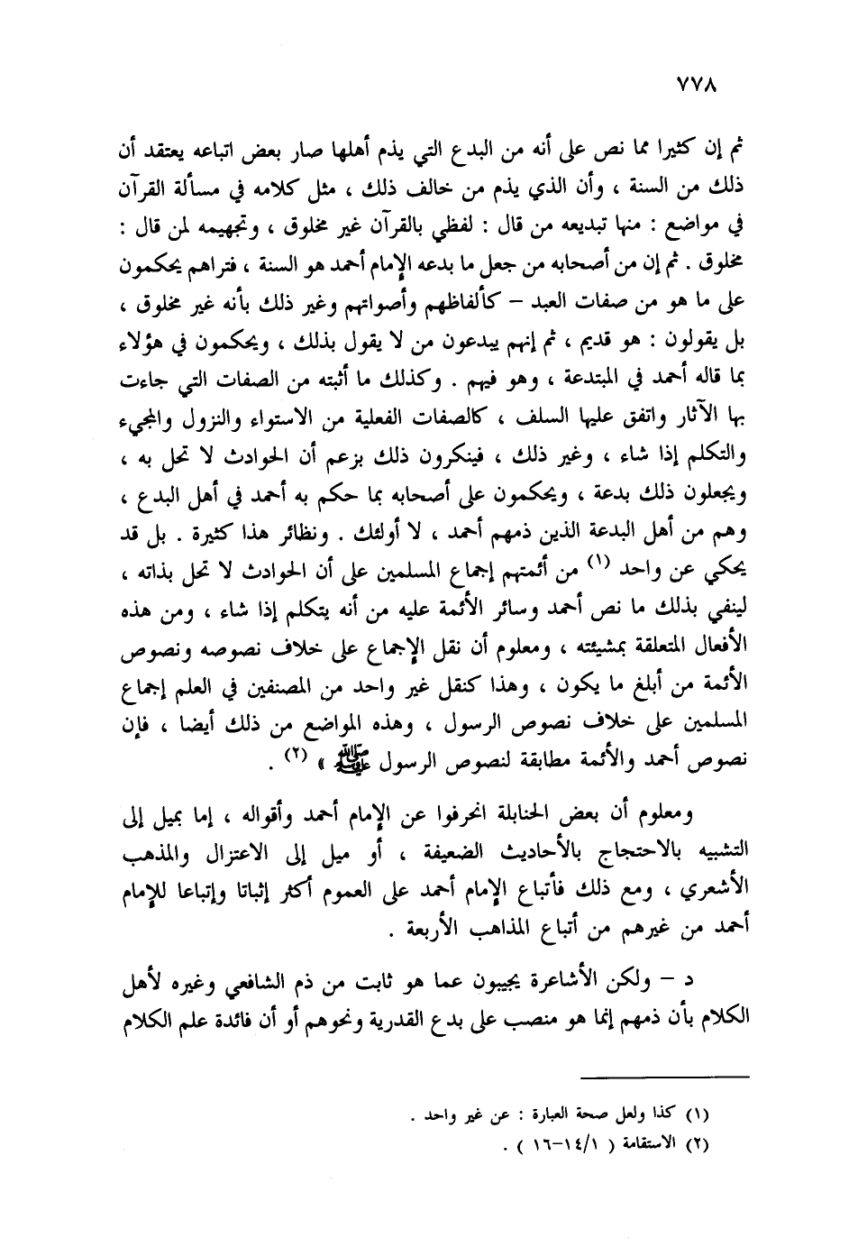 ثم إن كثيراً مما نص على أنه من البدع التي يذم أهلها صار بعض اتباعه يعتقد أن ذلك من السنة، وأن الذي يذم من خالف ذلك، مثل كلامه في مسألة القرآن من مواضع: منها تبديعه من قال: لفظي بالقرآن غير مخلوق، وتجهيمه لمن قال: مخلوق. ثم إن أصحابه من جعل ما بدعه الإمام أحمد هو السنة، فتراهم يحكمون على ماهو من صفات العبد - كألفاظهم وأصواتهم وغير ذلك بأنه غير مخلوق، بل يقولون: هو قديم، ثم إنهم يبدعون من لا يقول بذلك، ويحكمون في هؤلاء بما قاله أحمد في المبتدعة، وهو فيهم، وكذلك ما أثبته من الصفات التي جاءت بها الآثار واتفق عليها السلف، كالصفات الفعلية من الاستواء والنزول والمجيء والتكلم إذا شاء، وغير ذلك، فينكرون ذلك بزعم أن الحوادث لا تحل به، ويجعلون ذلك بدعة، ويحكمون على أصحابه بما حكم به أحمد في أهل البدع، وهمن من أهل البدعة الذين ذمهم أحمد، لا أولئك. ونظائر هذا كثيرة، بل قد يحكي عن واحد (¬1) ، من أئمتهم إجماع المسلمين على أن الحوادث لا تحل بذاته، لينفي بذلك ما نص أحمد وسائر الأئمة عليه من أنه يتكلم إذا شاء، ومن هذه الأفعال المتعلقة بمشيئته، ومعلوم أن نقل الإجماع على خلاف نصوصه ونصوص الأئمة من أبلغ ما يكون، وهذا كنقل غير واحد من المصنفين في العلم إجماع المسلمين على خلاف نصوص الرسول، وهذه المواضع من ذلك أيضاً، فإن نصوص أحمد والأئمة مطابقة لنصوص الرسول - صلى الله عليه وسلم - (¬2) .