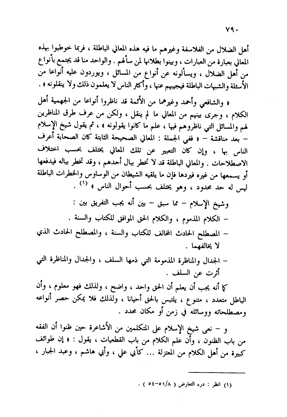 " والشافعي وأحمد وغيرهم من الأئمة قد ناظروا أنواعاً من الجهمية أهل الكلام، وجرى بينهم من المعاني ما لم ينقل، ولكن من عرف طرق المناظرين لهم والمسائل التي ناظروهم فيها، علم ما كانوا يقولونه "، ثم يقول شيخ الإسلام - بعد مناقشة - " ففي الجملة: المعاني الصحيحة الثابتة كان الصحابة أعرف الناس بها، وإن كان التعبير عن تلك المعاني يختلف بحسب اختلاف الاصطلاحات. والمعاني الباطلة قد لا تخطر ببال أحدهم، وقد تخطر بباله فيدفعها أو يسمعها من غيره فيردها فإن ما يلقيه الشيطان من الوساوس والخطرات الباطلة ليس له حد محدود، وهو يختلف بحسب أحوال الناس " (¬1) .