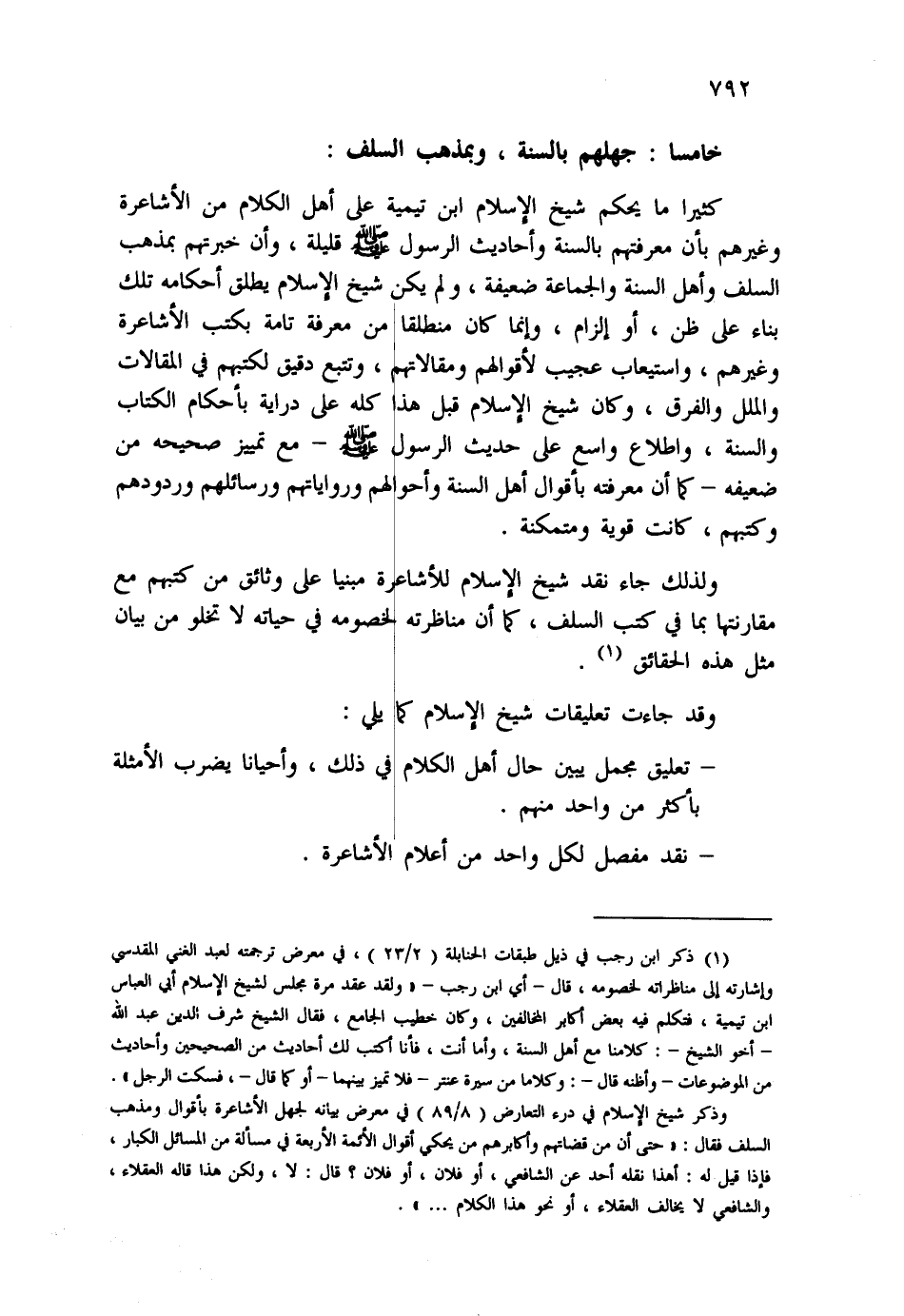 (¬1) ذكر ابن رجب في ذيل طبقات الحنابلة (2/23) ، في معرض ترجمته لعبد الغني المقدسي وإشارت إلى مناظرته لخصومه، قال - أي ابن رجب - " لقد عقد مرة مجلس لشيخ الإسلام أبي العباس ابن تيمية، فتكلم فيه بعض أكابر المخالفين، وكان خطيب الجامع، فقال شيخ شرف الدين عبد الله -أخو الشيخ- كلامنا مع أهل السنة، وأما أنت، فأنا أكتب لك أحاديث من الصحيحين وأحاديث من الموضوعات - وأظنه قال: وكلاماً من سيرة عنتر- فلا تميز بينهما - أو كما قال -فسكت الرجل " وذكر شيخ الإسلام في درء التعارض (8/89) ، في معرض بيانه لجهل الأشاعرة بأقوال ومذهب السف فقال: " حتى أن من قضاتهم وأكابرهم من يحكي أقوال الأئمة الأربعة في مسألة من المسائل الكبار، فإذا قيل له: أهذا نقله أحد عن الشافعي، أو فلان، أو فلان؟ قال: لا، ولكن هذا قاله العقلاء، والشافعي لا يخالف العقلاء، أو نحو هذا الكلام..".