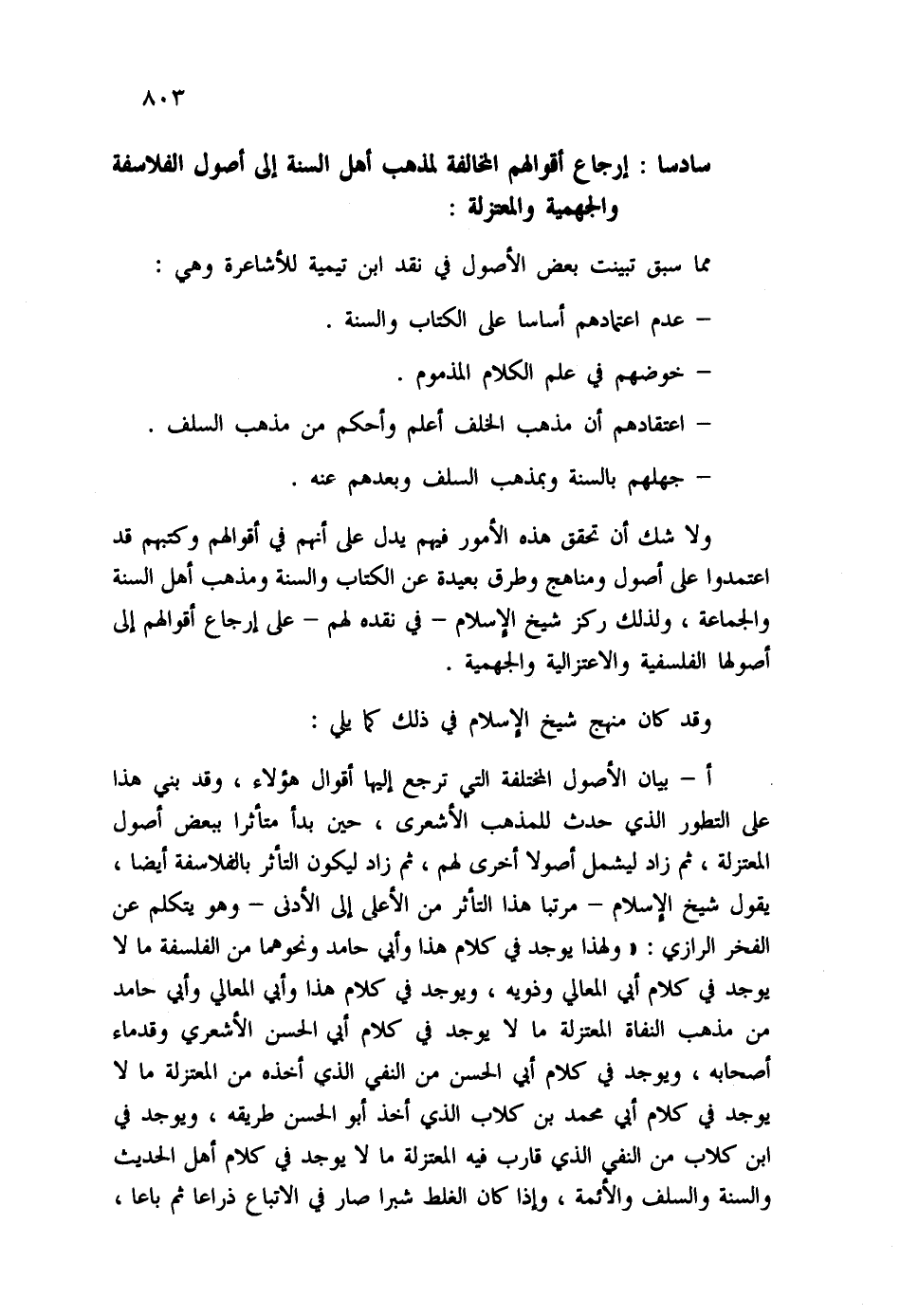 ولا شك أن تحقق هذه الأمور فيهم يدل على أنهم في أقوالهم وكتبهم قد اعتمدوا على أصول ومناهج وطرق بعيدة عن الكتاب والسنة ومذهب أهل السنة والجماعة، ولذلك ركز شيخ الإسلام -في نقده لهم - على إرجاع أقوالهم إلى أصولها الفلسفية والاعتزالية والجهمية.