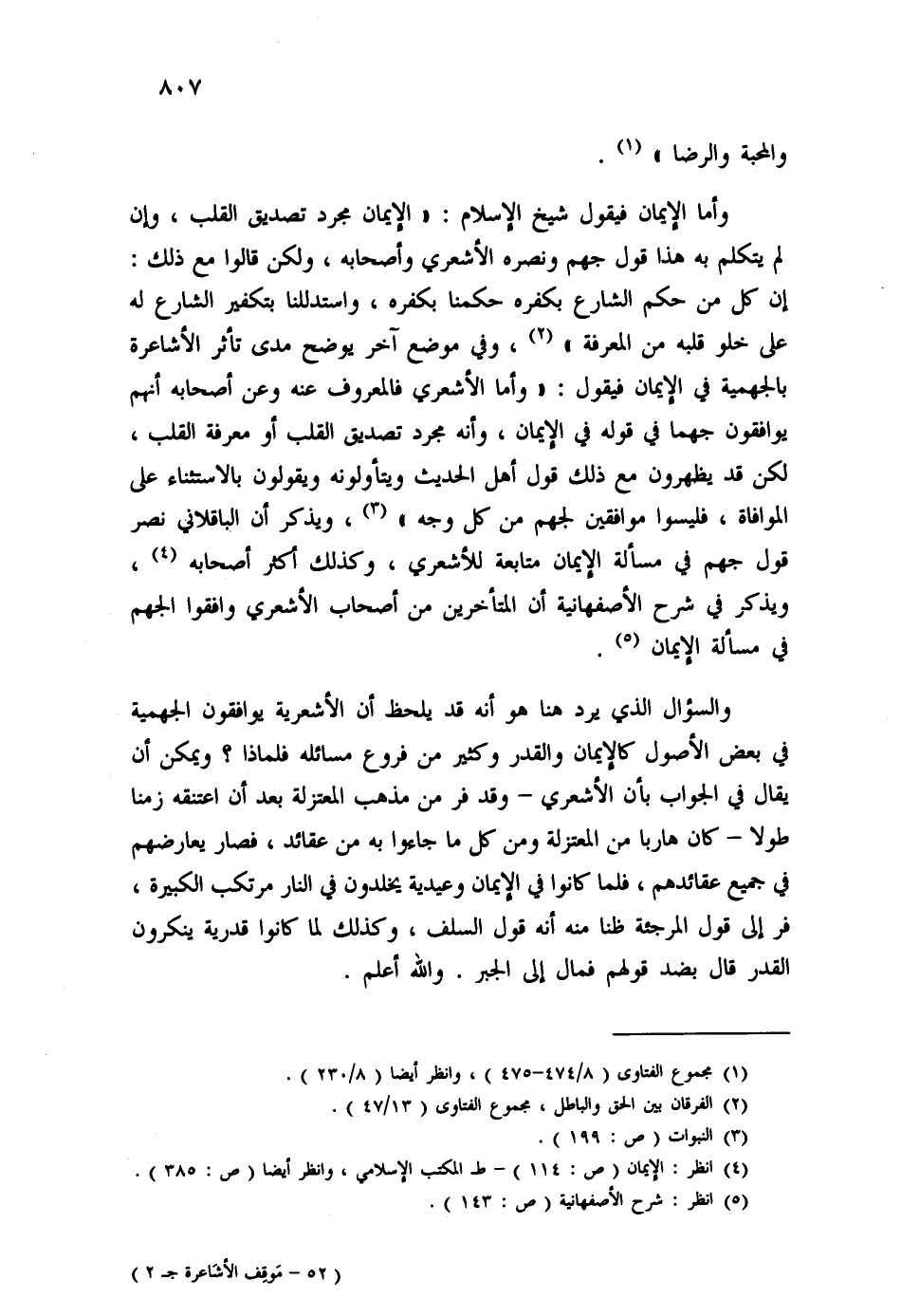 وأما الإيمان فيقول شيخ الإسلام: " الإيمان مجرد تصديق القلب، وإن لم يتكلم به هذا قول جهم ونصره الأشعري وأصحابه، ولكن قالوا مع ذلك: إن كل من حكم الشارع بكفره حكمنا بكفره، واستدللنا بتكفير الشارع له على خلو قلبه من المعرفة " (¬2) ، وفي موضع آخر يوضح مدى تأثر الأشاعرة بالجهمية في الإيمان فيقول: " وأما الأشعري فالمعروف عنه وعن أصحابه أنهم يوافقون جهماً في قوله في الإيمان، وأنه مجرد التصديق القلب أو معرفة القلب، لكن قد يظهرون مع ذلك قول أهل الحديث ويتأولونه ويقولون بالاستثناء على الموافاة، فليسوا موافقين لجهم من كل وجه" (¬3) ، ويذكر أن الباقلاني نصر قول جهم في مسألة الإيمان متابعة للأشعري، وكذلك أكثر أصحابه (¬4) ، ويذكر في شرح الأصفهانية أن المتأخرين من أصحاب الأشعري وافقوا الجهم في مسألة الإيمان (¬5) .