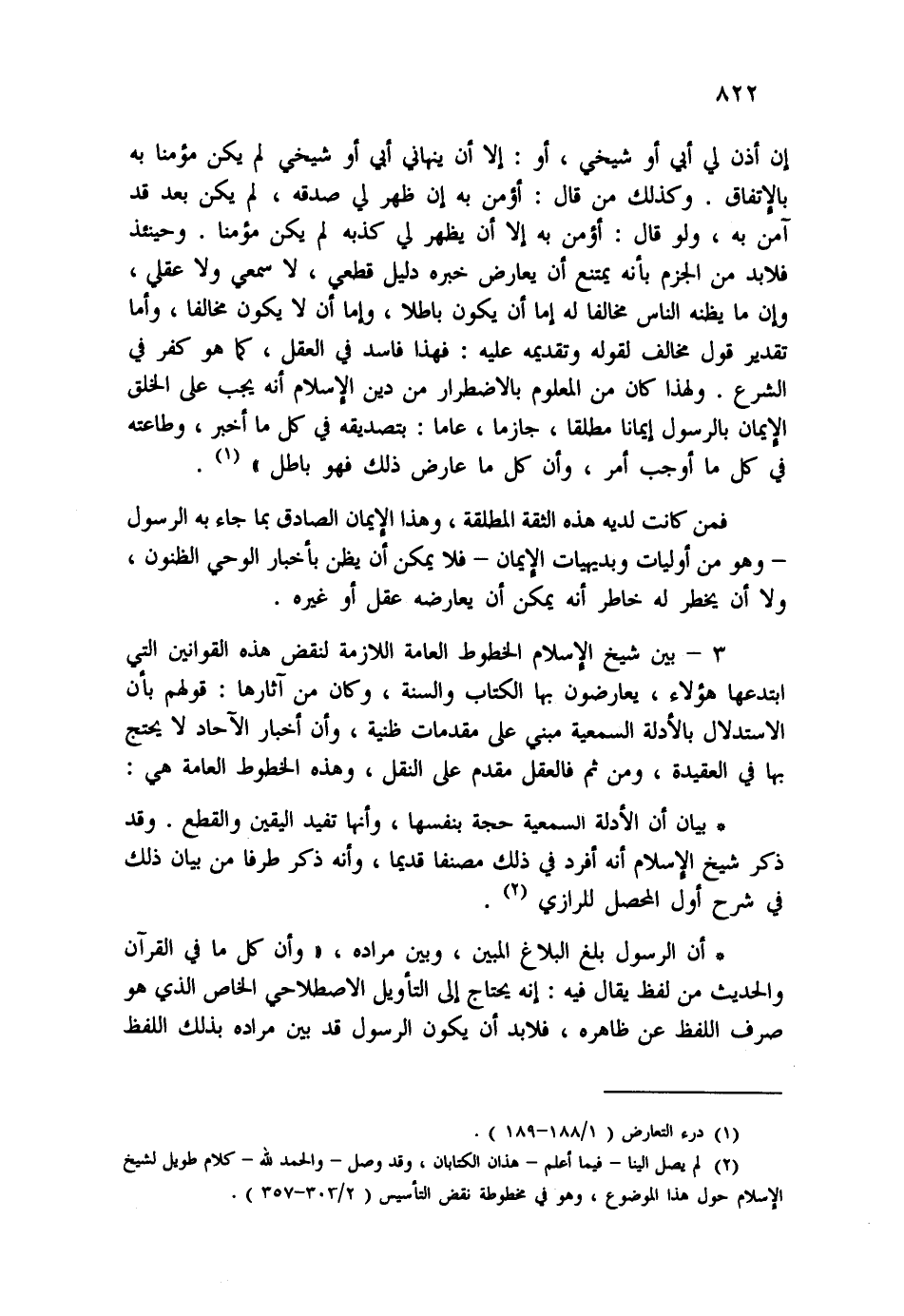 إن أذن لي أبي أو شيخي، أو: إلا أن ينهاني أبي أو شيخي لم يكن مؤمناً به بالاتفاق، وكذلك من قال: أؤمن به إن ظهر لي صدقه، لم يكن بعد قد آمن به، ولو قال: أؤمن به إلا أن يظهر لي كذبة لم يكن مؤمناً، وحينئذٍ فلابد من الجزم بأنه يمتنع أن يعارض خبره دليل قطعي، لا سمعي ولا عقلي، وإن ما يظنه الناس مخالفاً له إما أن يكون باطلاً، وإما أن لا يكون مخالفاً، وأما تقدير قول مخالف لقوله وتقديمه عليه: فهذا فاسد في العقل، كما هو كفر في الشرع، ولهذا كان من المعلوم بالاضطرار من دين الإسلام أنه يجب على الخلق الإيمان بالرسول إيماناً مطلقاً، جازماً، عاماً: بتصديقه في كل ما أخبر، وطاعته في كل ما أوجب أمر، وأن كل ما عارض ذلك فهو باطل" (¬1) .
