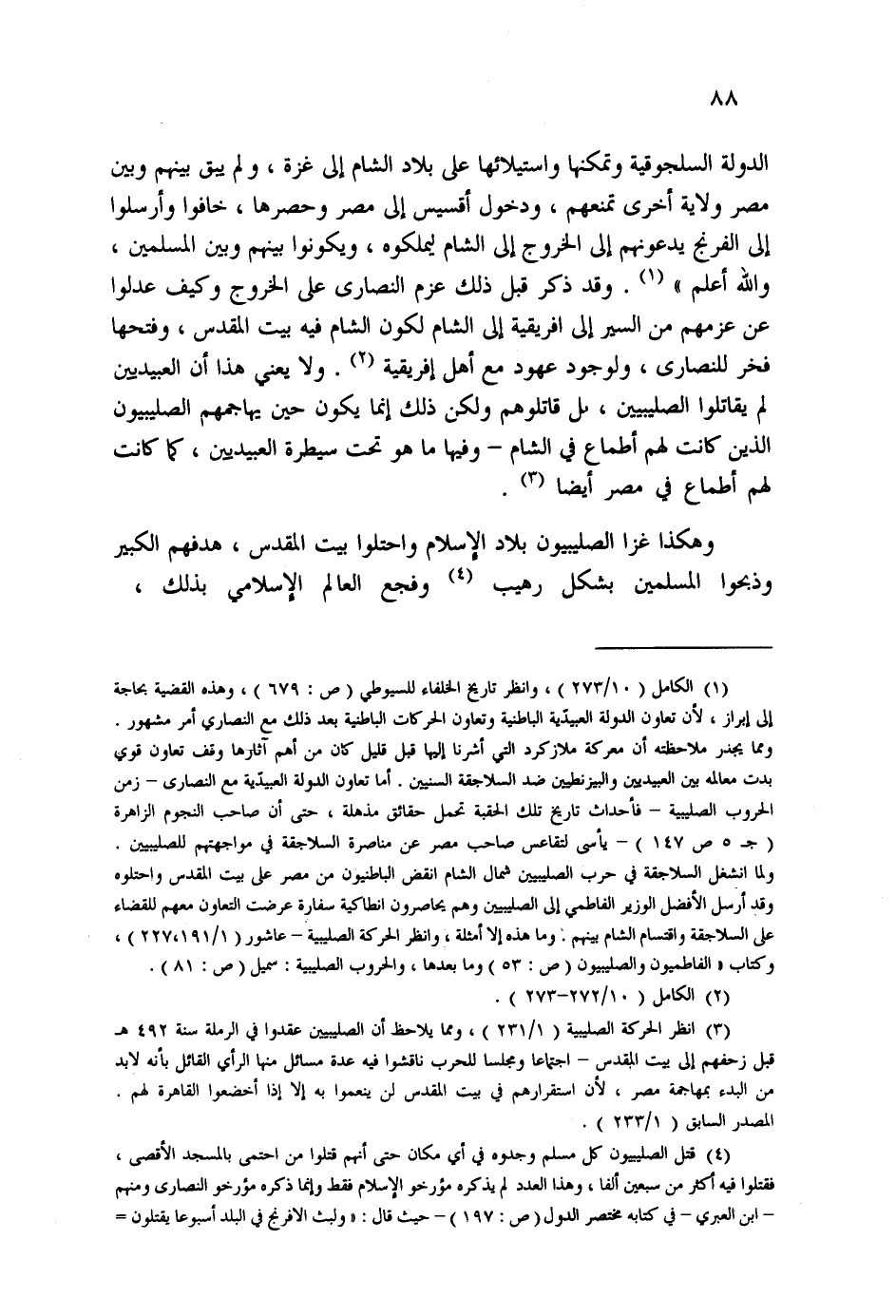 (¬1) الكامل (10/ 273) ، وانظر تاريخ الخلفاء للسيوطي (ص: 679) ، وهذه القضية بحاجة إلى إبراز، لأن تعاون الدولة العبيدية الباطنية وتعاون الحركات الباطنية بعد ذلك مع النصارى أمر مشهور. ومما يجدر ملاحظته أن معركة ملازكرد التي أشرنا إليها قبل قليل كان من أهم آثارها وقف تعاون قوي بدت معالمه بين العبيديين والبيزنطين ضد السلاجقة السنيين. أما تعاون الدولة العبيدية مع النصارى- زمن الحروب الصليبية- فأحداث تاريخ تلك الحقبة تحمل حقائق مذهلة، حتى أن صاحب النجوم الزاهرة (ج- 5 ص 147) - يأسى لتقاعس صاحب مصر عن مناصرة السلاجقة في مواجهتهم للصليبيين. ولما انشغل السلاجقة في حرب الصليبيين شمال الشام انقض الباطنيون من مصر على بيت المقدس واحتلوه وقد أرسل الأفضل الوزير الفاطمي إلى الصليبيين وهم يحاصرون انطاكية سفارة عرضت التعاون معهم للقضاء على السلاجقة واقتسام الشام بينهم. وما هذه إلا أمثلة، وانظر الحركة الصليبية- عاشور (1/191،227) ، وكتاب " الفاطميون والصليبيون (ص: 53) وما بعدها، والحروب الصليبية: سميل (ص: 81) .