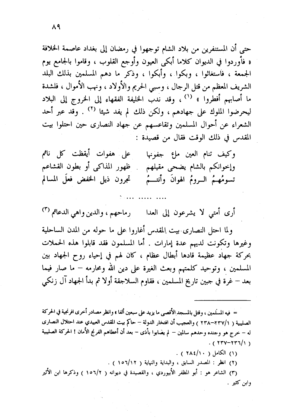 وقد ندب الخليفة الفقهاء إلى الخروج إلى البلاد ليحرضوا الملوك على جهادهم، ولكن ذلك لم يفد شيئا (¬2) . وقد عبر أحد الشعراء عن أحوال المسلمين وتقاعسهم عن جهاد النصارى حين احتلوا بيت المقدس في ذلك الوقت فقال من قصيدة: