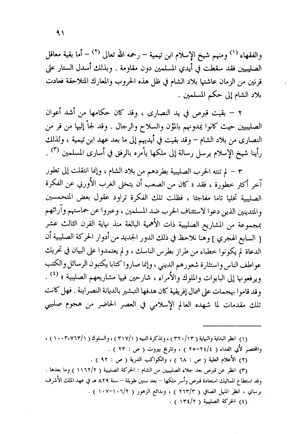 والفقهاء (¬1) ومنهم شيخ الاسلام ابن تيمية-رحمه الله- تعالى (¬2) - أما بقية معاقل الصليبيين فقد سقطت في أيدي المسلمين دون مقاومة. وبذلك أسدل الستار على قرنين من الزمان عاشتها بلاد الشام في ظل هذه الحروب والمعارك المتلاحقة فعادت بلاد الشام إلى حكم المسلمين.