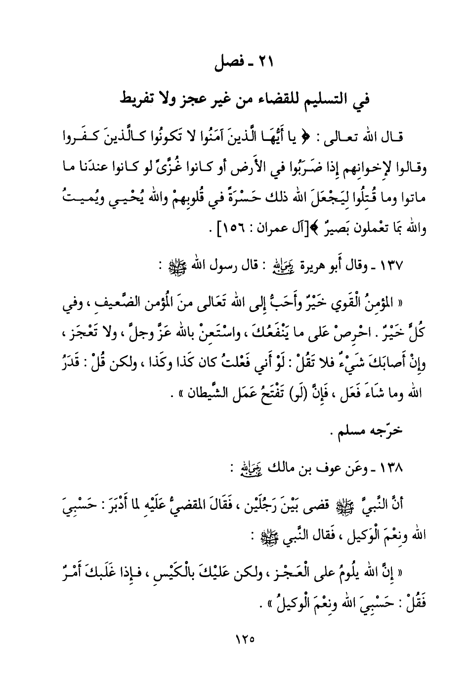 إن الله يلوم على العجز ولكن عليك بالكيس فإذا غلبك أمر فقل: حسبي الله ونعم الوكيل