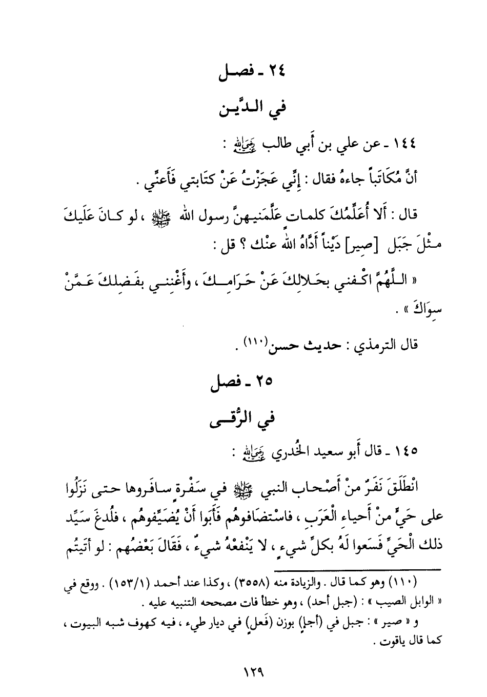 انطلق نفر من أصحاب النبي صلى الله عليه وسلم في سفرة سافروها حتى نزلوا على حي من أحياء العرب فاستضافوهم فأبوا أن يضيفوهم فلدغ سيد ذلك الحي فسعوا له بكل شيء لا ينفعه شيء فقال بغضهم: لو أتيتم هؤلاء الرهط الذين نزلوا لعله أن يكون عند بعضهم شيء فأتوهم فقالوا: [يا] أيها الرهط إن سيدنا لدغ وسعينا له بكل شيء لا ينفعه فهل عند أحد منكم من شيء؟ فقال بعضهم: والله إني لأرقي ولكن والله لقد استضفناكم فلم تضيفونا فما أنا براق لكم حتى تجعلوا لنا جعلا فصالحوهم على قطيع من الغنم فانطلق يتفل عليه ويقرأ (الحمد لله رب العالمين) فكأنما نشط من عقال فانطلق يمشي وما به قلبة [قال:] فأوفوهم جعلهم الذي صالحوهم عليه فقال بعضهم: اقسموا فقال الذي رقى: لا تفعلوا حتى نأتي رسول الله A فنذكر له الذي كان [فننظر ما يأمرنا] فقدموا على رسول الله A فذكروا له فقال:
