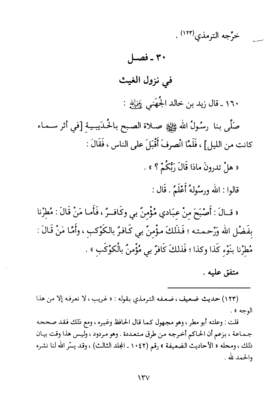 قال: أصبح من عبادي مؤمن بي وكافر فأما من قال: مطرنا بفضل الله ورحمته فذلك مؤمن بي كافر بالكوكب وأما من قال: مطرنا بنوء كذا وكذا فذلك كافر بي مؤمن بالكواكب