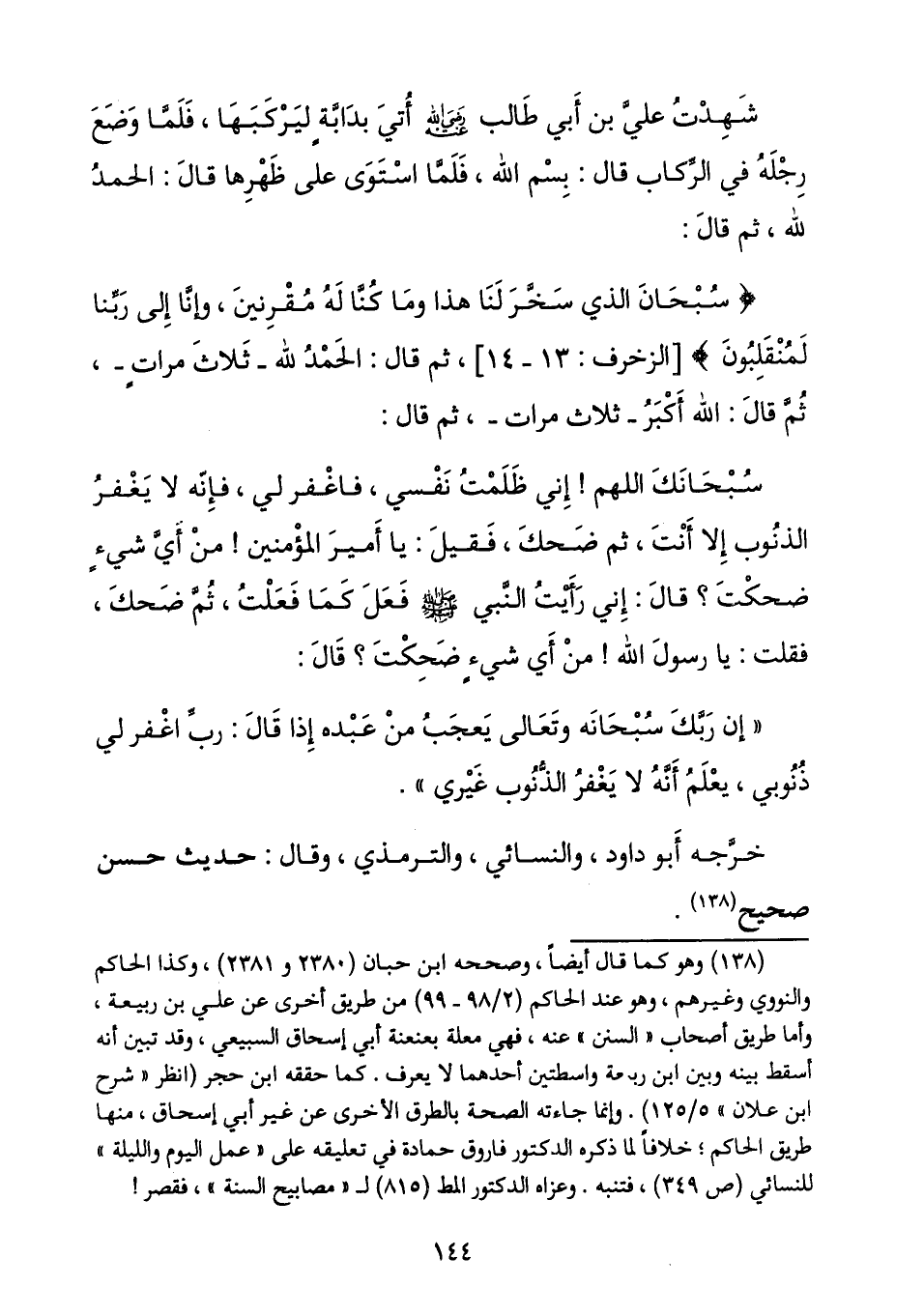 شهدت علي بن أبي طالب Bهـ أتي بدابة ليركبها فلما وضع رجله في الركاب قال: بسم الله فلما استوى على ظهرها قال: الحمد لله ثم قال:
