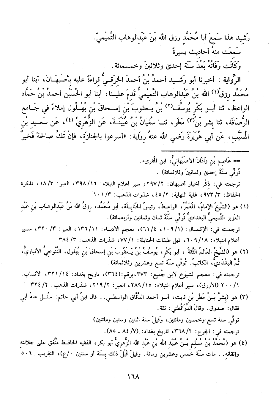 أَخْبَرَنَا أَبُو رُشَيْدٍ أَحْمَدُ بْنُ أَحْمَدَ الْخَرَقِيُّ، قِرَاءَةً عَلَيْهِ بِأَصْبَهَانَ، أَبْنَا أَبُو مُحَمَّدٍ رِزْقُ اللَّهِ بْنُ عَبْدِ الْوَهَّابِ التَّمِيمِيُّ قَدِمَ عَلَيْنَا، أَبْنَا أَبُو الْحُسَيْنِ أَحْمَدُ بْنُ حَمَّادٍ الْوَاعِظُ، ثنا أَبُو بَكْرٍ يُوسُفُ بْنُ يَعْقُوبَ بْنِ إِسْحَاقَ بْنِ بُهْلُولٍ، إِمْلاءً فِي جَامِعِ الرُّصَافَةِ، ثنا بِشْرُ بْنُ مَطَرٍ، ثنا سُفْيَانُ بْنُ عُيَيْنَةَ، عَنِ الزُّهْرِيِّ، عَنْ سَعِيدِ بْنِ الْمُسَيِّبِ، عَنْ أَبِي هُرَيْرَةَ، رَضِيَ اللَّهُ عَنْهُ، رِوَايَةَ: «أَسْرِعُوا بِالْجِنَازَةِ فَإِنْ تَكُ صَالِحَةً فَخَيْرٌ