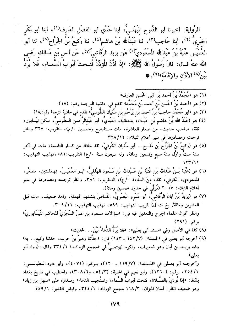 أَخْبَرَنَا أَبُو الْفُتُوحِ الْمِيهَنِيُّ، أبنا جَدِّي أَبُو الْفَضْلِ الْعَارِفُ، أَبْنَا أَبُو بَكْرٍ الْحِيرِيُّ، أَبْنَا حَاجِبٌ، ثنا عَبْدُ اللَّهِ بْنُ هَاشِمٍ، ثَنا وَكِيعُ بْنُ الْجَرَّاحِ، ثَنَا أَبُو الْعُمَيْسِ عُتْبَةُ بْنُ عَبْدِ اللَّهِ الْمَسْعُودِيُّ، عَنْ يَزِيدَ الرَّقَاشِيِّ، عَنْ أَنَسِ بْنِ مَالِكٍ، رَضِيَ اللَّهُ عَنْهُ، قَالَ: قَالَ رَسُولُ اللَّهِ، صَلَّى اللَّهُ عَلَيْهِ وَسَلَّمَ: «إِذَا أَذَّنَ الْمُؤَذِّنُ فُتِحَتْ أَبْوَابُ السَّمَاءِ، فَلا يُرَدُّ بَيْنَ الأَذَانِ وَالإِقَامَةِ»