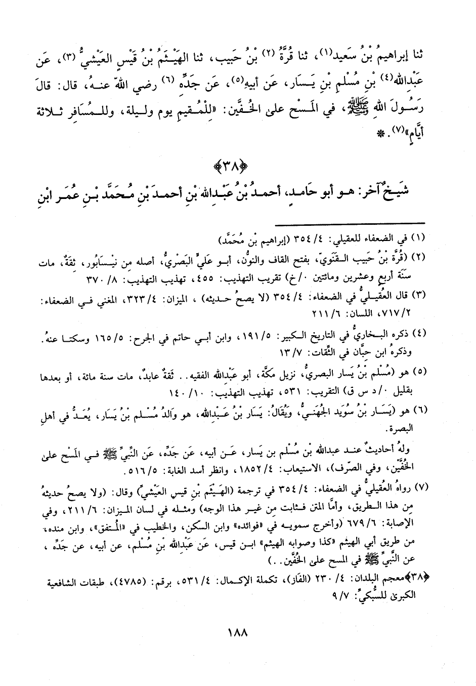 . .، ثنا إِبْرَاهِيمُ بْنُ سَعِيدٍ، ثنا قُرَّةُ بْنُ حَبِيبٍ، ثنا الْهَيْثَمُ بْنُ قَيْسٍ الْعَيْشِيُّ، عن عَبْدِ اللَّهِ بْنِ مُسْلِمِ بْنِ يَسَارٍ، عَنْ أَبِيهِ، عَنْ جَدِّهِ، رَضِيَ اللَّهُ عَنْهُ، قَالَ: قَالَ رَسُولُ اللَّهِ، صَلَّى اللَّهُ عَلَيْهِ وَسَلَّمَ، فِي الْمَسْحِ عَلَى الْخُفَّيْنِ: «لِلْمُقِيمِ يَوْمٌ وَلَيْلَةٌ، وَلِلْمُسَافِرِ ثَلاثَةُ أَيَّامٍ»