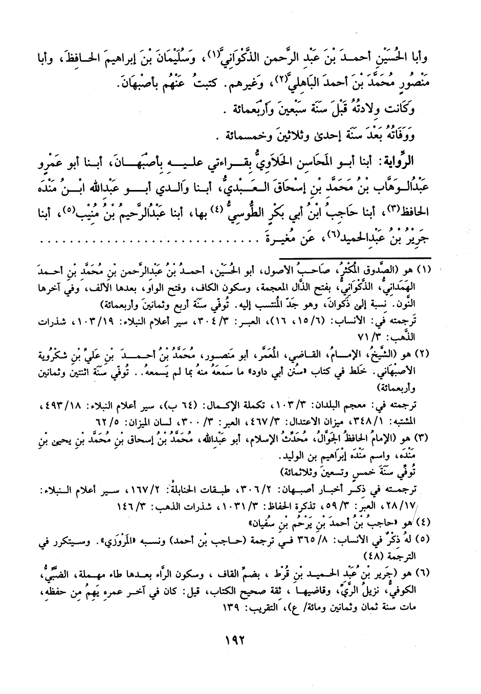 أبنا أَبُو الْمَحَاسِنِ الْحَلاوِيُّ، بِقِرَاءَتِي عَلَيْهِ بِأَصْبَهَانَ، أَبْنَا أَبُو عَمْرٍو عَبْدُ الْوَهَّابِ بْنُ مُحَمَّدِ بْنِ إِسْحَاقَ الْعَبْدِيُّ، أبنا وَالِدِي أَبُو عَبْدِ اللَّهِ بْنُ مَنْدَهْ الْحَافِظُ، أَبْنَا حَاجِبُ بْنُ أَبِي بَكْرٍ الطُّوسِيُّ بِهَا، أَبْنَا عَبْدُ الرَّحِيمِ بْنُ مُنِيبٍ، أَبْنَا جَرِيرُ بْنُ عَبْدِ الْحَمِيدِ، عَنْ مُغِيرَةَ. . . . . . . . . . . . . . . . . . . . . . .