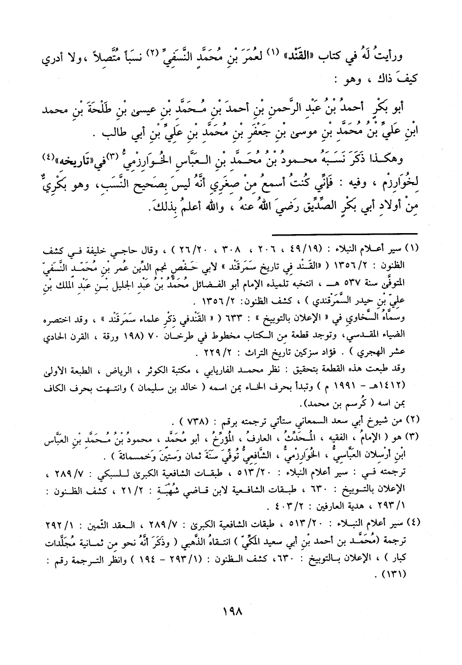 وَرَأَيْتُ لَهُ فِي كتاب القند لعمر بن محمد بن النسفي نسبا متصلا، ولا أدري كيف ذاك، وهو: أبو بكر أحمد بن عبد الرحمن بن أحمد بن محمد بن عيسى بن طلحة بن محمد بن علي بن محمد بن موسى بن جعفر بن محمد بن علي بن أبي طالب.