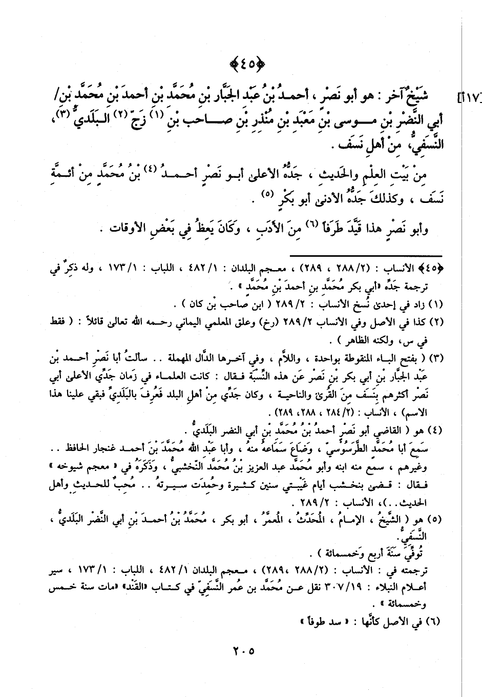 شيخ آخر: هو أبو نصر أحمد بن عبد الجبار بن محمد بن أحمد بن محمد بن أبي النضر بن موسى بن معبد بن منذر بن صاحب بن زج البلدي النسفي، من أهل نسف.