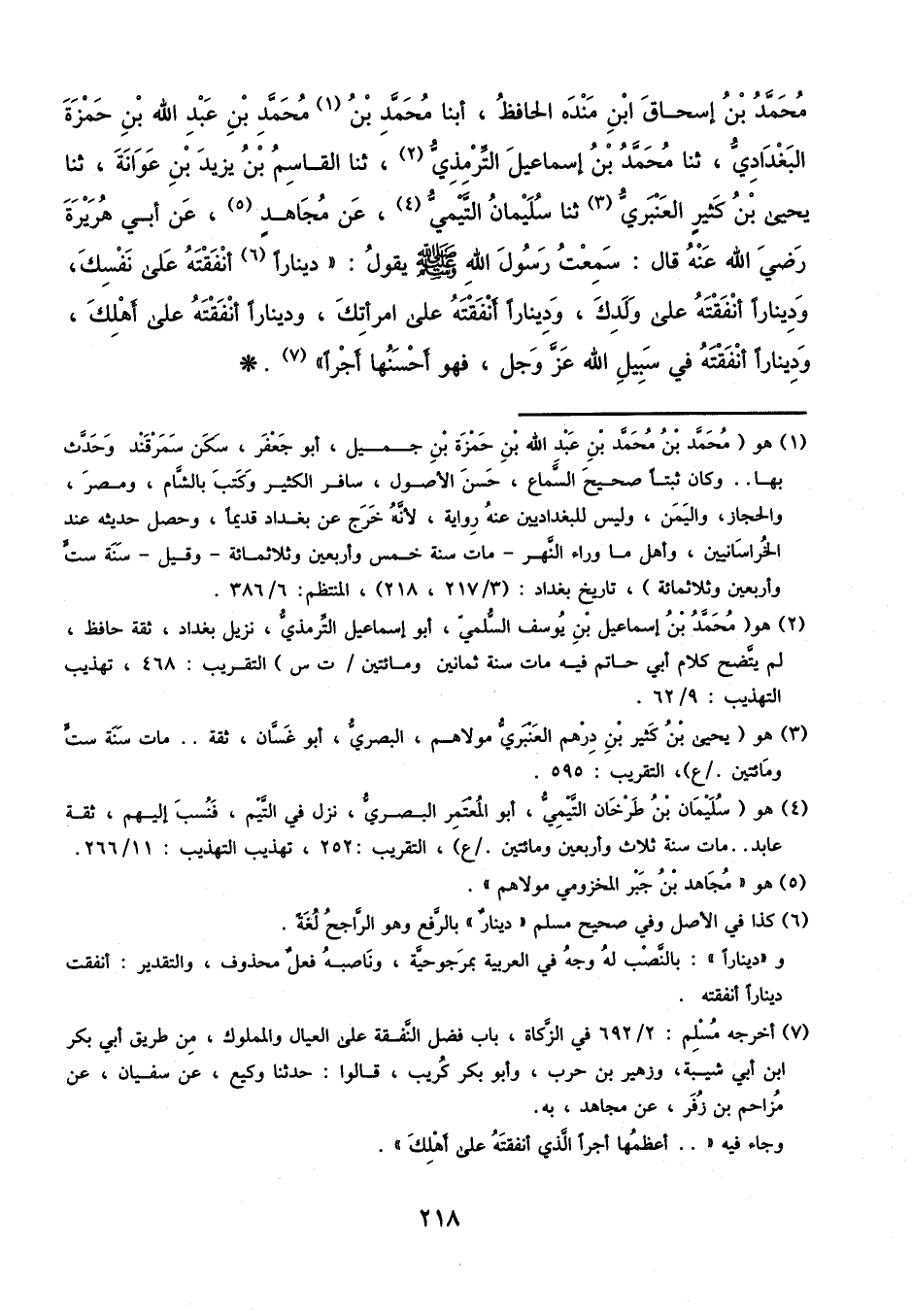 مُحَمَّدُ بْنُ إِسْحَاقَ بْنِ مَنْدَهْ الْحَافِظُ، أبنا مُحَمَّدُ بْنُ مُحَمَّدِ بْنِ عَبْدِ اللَّهِ بْنِ حَمْزَةَ الْبَغْدَادِيُّ، ثنا مُحَمَّدُ بْنُ إِسْمَاعِيلَ التِّرْمِذِيُّ، ثنا الْقَاسِمُ بْنُ يَزِيدَ بْنِ عَوَانَةَ، ثَنَا يَحْيَى بْنُ كَثِيرٍ الْعَنْبَرِيُّ، ثنا سُلَيْمَانُ التَّيْمِيُّ، عَنْ مُجَاهِدٍ، عَنْ أَبِي هُرَيْرَةَ، رَضِيَ اللَّهُ عَنْهُ، قَالَ: سَمِعْتُ رَسُولَ اللَّهِ، صَلَّى اللَّهُ عَلَيْهِ وَسَلَّمَ، يَقُولُ: «دِينَارًا أَنْفَقْتَهُ عَلَى نَفْسِكَ، وَدِينَارًا أَنْفَقْتَهُ عَلَى وَلَدِكَ، وَدِينَارًا أَنْفَقْتَهُ عَلَى امْرَأَتِكَ، وَدِينَارًا أَنْفَقْتَهُ عَلَى أَهْلِكَ، وَدِينَارًا فِي سَبِيلِ اللَّهِ، عَزَّ وَجَلَّ، فَهُوَ أَحْسَنُهَا أَجْرًا»