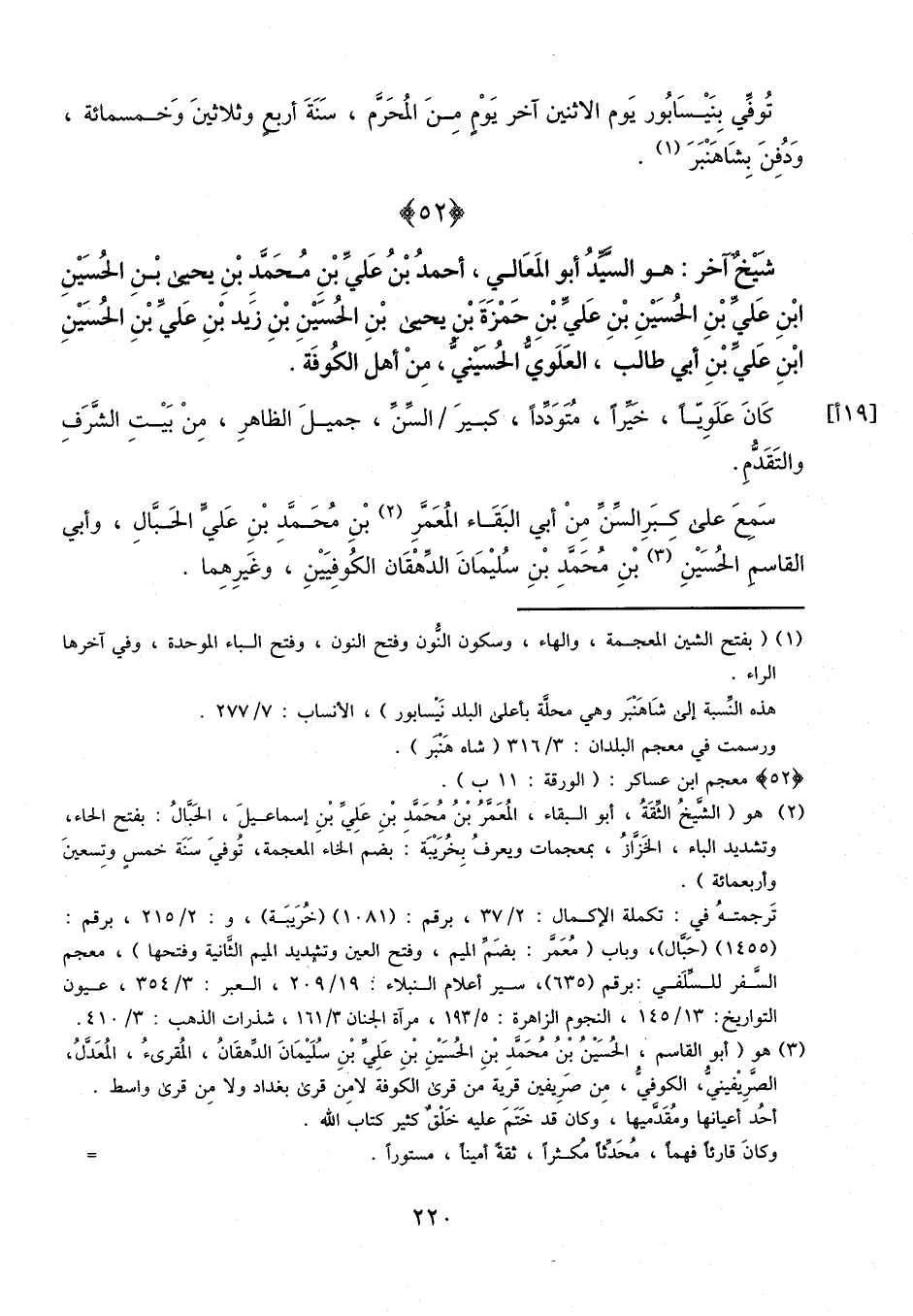 شيخ آخر: هو السيد أبو المعالي أحمد بن علي بن محمد بن يحيى بن الحسين بن علي بن الحسين بن علي بن حمزة بن يحيى بن الحسين بن زيد بن علي بن الحسين بن علي بن أبي طالب العلوي الحسيني، من أهل الكوفة.