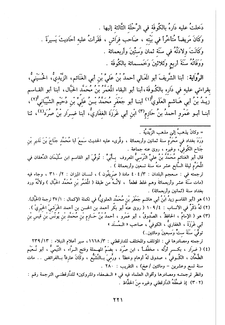 أبنا الشَّرِيفُ أَبُو الْمَعَالِي أَحْمَدُ بْنُ عَلِيِّ بْنِ أَبِي الْمَغَانِمِ الزَّيْدِيُّ الْحُسَيْنِيُّ، بِقِرَاءَتِي عَلَيْهِ فِي دَارِهِ بِالْكُوفَةِ، أبنا أَبُو الْبَقَاءِ الْمُعَمَّرُ بْنُ مُحَمَّدٍ الْحَبَّالُ، أبنا أَبُو الْقَاسِمِ زَيْدُ بْنُ أَبِي هَاشِمٍ الْعَلَوِيُّ، أبنا أَبُو جَعْفَرٍ مُحَمَّدُ بْنُ عَلِيِّ بْنِ دُحَيْمٍ الشَّيْبَانِيُّ، أبنا أَبُو عَمْرٍو أَحْمَدُ بْنُ حَازِمِ بْنِ أَبِي غَرْزَةَ الْغِفَارِيُّ، أبنا ضِرَارُ بْنُ صُرَدَ، ثَنَا