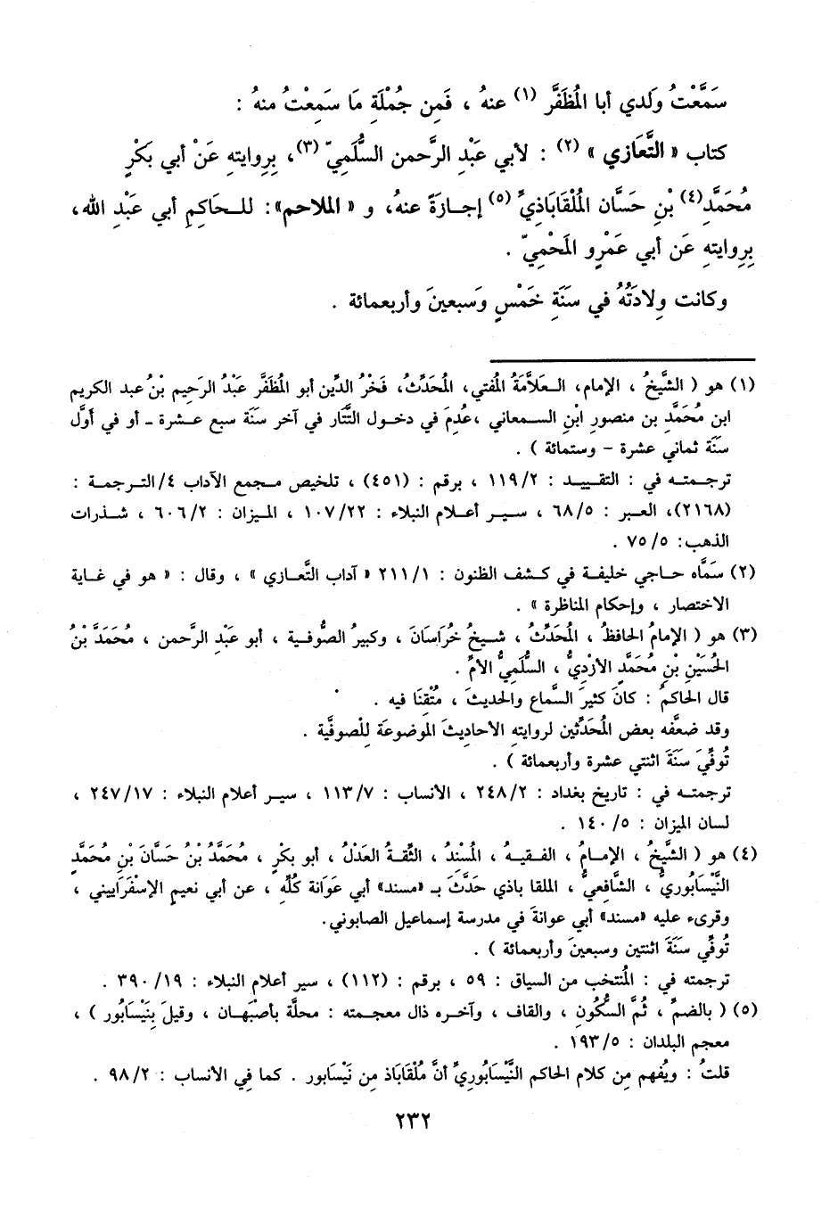 سَمَّعْتُ ولدي أبا المظفر عنه، فمن جملة ما سمعت منه: كتاب التعازي لأبي عبد الرحمن السلمي، بروايته عن أبي بكر محمد بن حسان الملقاباذي إجازة عنه، والملاحم للحاكم أبي عبد الله، بروايته عن أبي عمرو المحمي.
