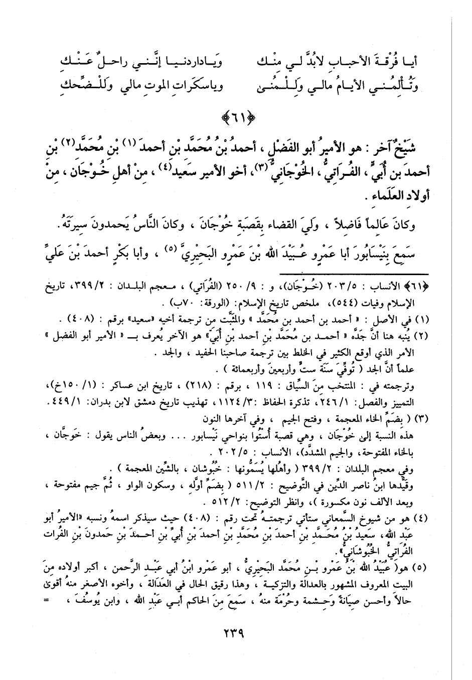 شيخ آخر: هو الأمير أبو الفضل أحمد بن محمد بن أحمد بن محمد بن أحمد بن أبي الفراتي الخوجاني، أخو الأمير سعيد، من أهل خوجان، من أولاد العلماء.