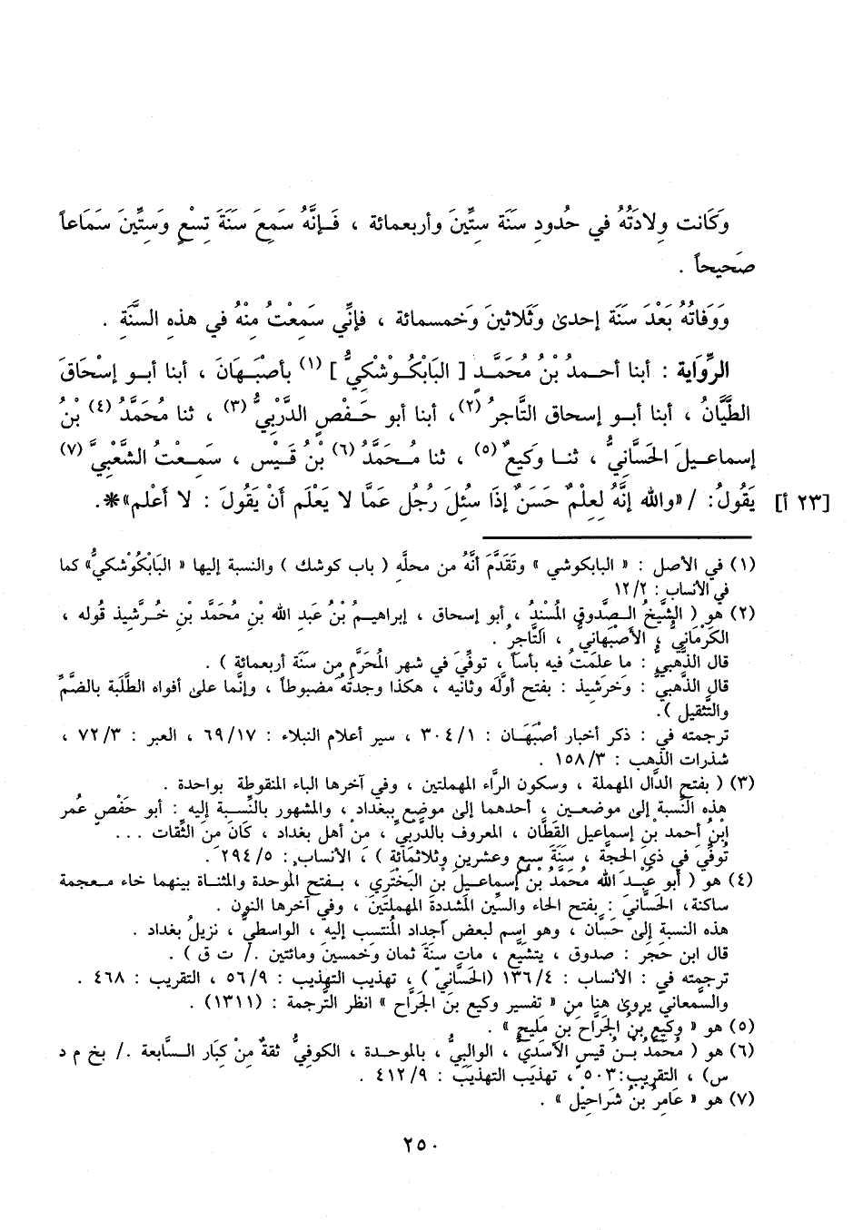 أبنا أحمد بن محمد البابكوشكي بأصبهان، أبنا أبو إسحاق الطيان، أبنا أبو إسحاق التاجر، أبنا أبو حفص الدربي، ثنا محمد بن إسماعيل الحساني، ثنا وكيع، ثنا محمد بن قيس، سمعت الشعبي، يقول: والله إنه لعلم حسن إذا سئل رجل عما لا يعلم أن يقول: لا أعلم