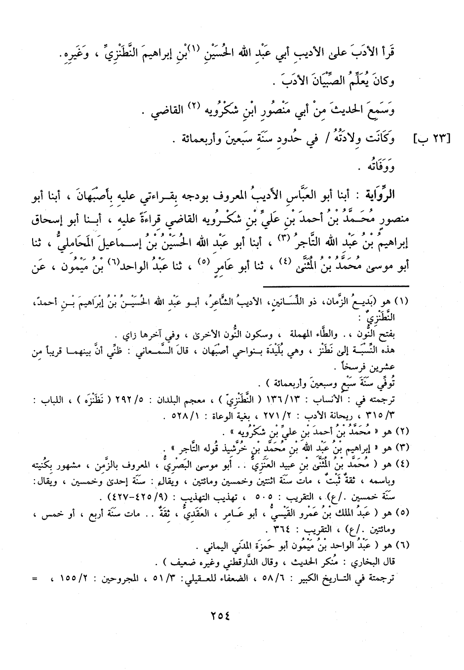 أبنا أَبُو الْعَبَّاسِ الأَدِيبُ الْمَعْرُوفُ بِوَدْجَهْ، بِقِرَاءَتِي عَلَيْهِ بِأَصْبَهَانَ، أَبنا أَبُو مَنْصُورٍ مُحَمَّدُ بْنُ أَحْمَدَ بْنِ عَلِيِّ بْنِ شُكْرَوَيْهِ الْقَاضِي، قِرَاءَةً عَلَيْهِ، أبنا أَبُو إِسْحَاقَ بْنُ إِبْرَاهِيمَ بْنِ عَبْدِ اللَّهِ التَّاجِرُ، أبنا أَبُو عَبْدِ اللَّهِ الْحُسَيْنُ بْنُ إِسْمَاعِيلَ الْمَحَامِلِيُّ، ثنا أَبُو مُوسَى مُحَمَّدُ بْنُ الْمُثَنَّى، ثنا أَبُو عَامِرٍ، ثنا عَبْدُ الْوَاحِدِ بْنُ مَيْمُونٍ، عَنْ