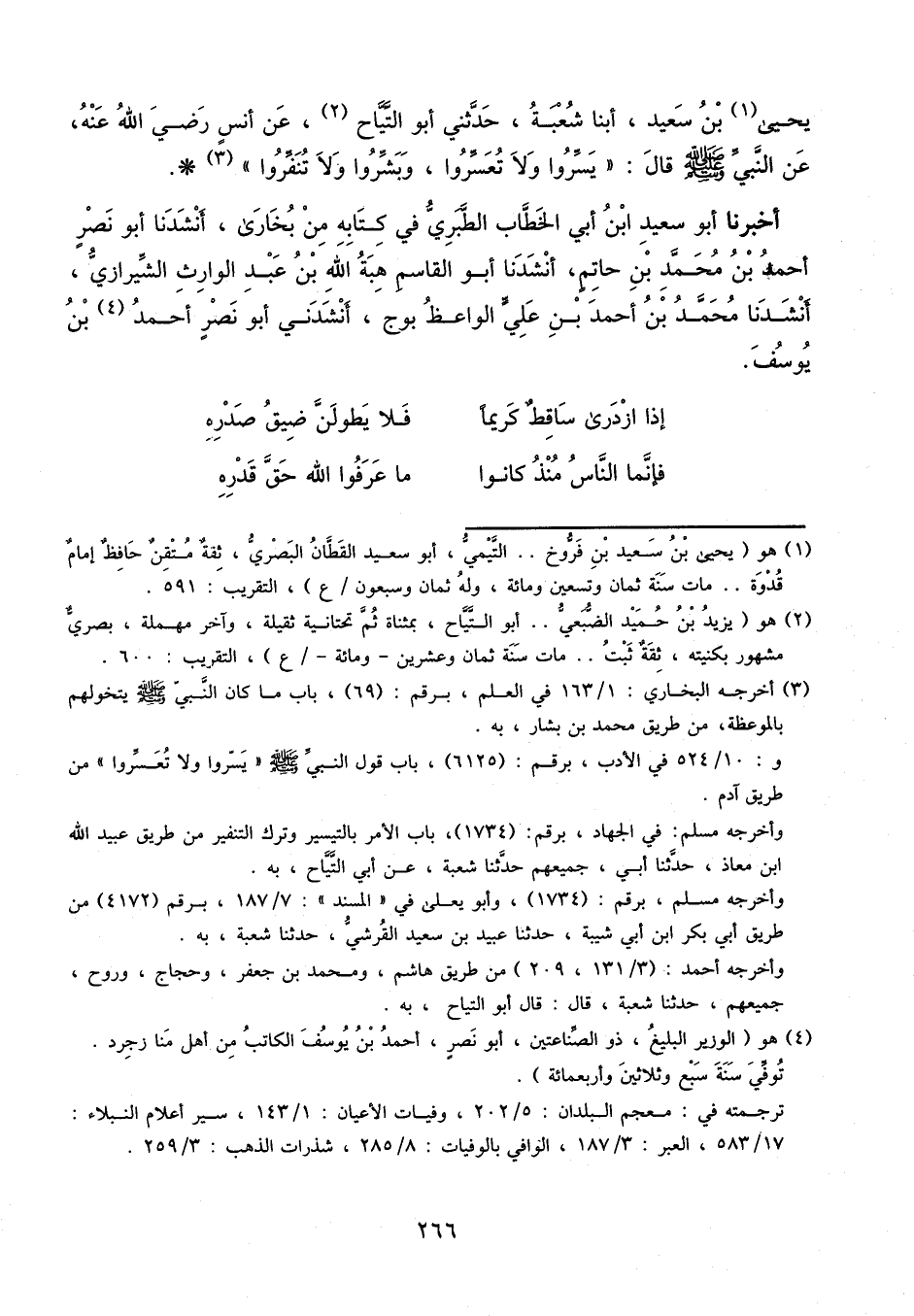 يَحْيَى بْنُ سَعِيدٍ، أبنا شُعْبَةُ، حَدَّثَنِي أَبُو التَّيَّاحِ، عَنْ أَنَسِ، رَضِيَ اللَّهُ عَنْهُ، عَنِ النَّبِيِّ صَلَّى اللَّهُ عَلَيْهِ وَسَلَّمَ، قَالَ: «يَسِّرُوا وَلَا تُعَسِّرُوا، وَبَشِّرُوا وَلَا تُنَفِّرُوا»