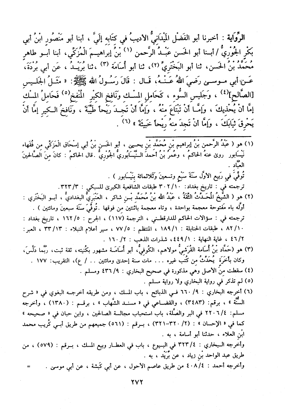 أَخْبَرَنَا أَبُو الْفَضْلِ الْمَيْدَانِيُّ الأَدِيبُ فِي كِتَابِهِ إِلَيَّ، أَبْنَا أَبُو مَنْصُورِ بْنُ أَبِي بَكْرٍ الْجُورِيُّ، أبنا أَبُو الْحَسَنِ عَبْدُ الرَّحْمَنِ بْنُ إِبْرَاهِيمَ الْمُزَكِّي، أبنا أَبُو طَاهِرٍ مُحَمَّدُ بْنُ الْحَسَنِ، ثنا أَبُو الْبَخْتَرِيِّ، ثَنَا أَبُو أُسَامَةَ، ثنا بُرَيْدٍ، عَنْ أَبِي بُرْدَةَ، عَنْ أَبِي مُوسَى، رَضِيَ اللَّهُ عَنْهُ، قَالَ: قَالَ رَسُولُ اللَّهِ، صَلَّى اللَّهُ عَلَيْهِ وَسَلَّمَ: «مَثَلُ الْجَلِيسِ الصَّالِحِ وَجَلِيسِ السَّوْءِ، كَحَامِلِ الْمِسْكِ وَنَافِخِ الْكِيرِ، فَحَامِلُ الْمِسْكِ إِمَّا أَنْ يُحْذِيَكَ، وَإِمَّا أَنْ تَبْتَاعَ مِنْهُ، وَإِمَّا أَنْ تَجِدَ رِيحًا طَيِّبَةً، وَنَافِخُ الْكِيرِ، إِمَّا أَنْ يُحْرِقَ ثِيَابَكَ، وَإِمَّا أَنْ تَجِدَ مِنْهُ رِيحًا خَبِيثَةً» .