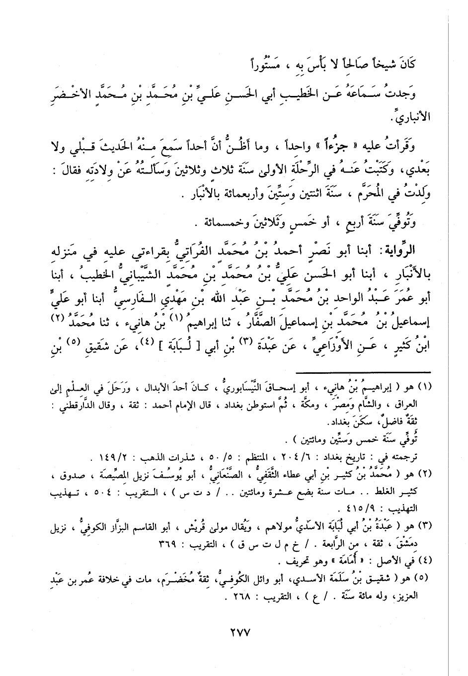 أبنا أَبُو نَصْرٍ أَحْمَدُ بْنُ مُحَمَّدٍ الْفُرَاتِيُّ، بِقِرَاءَتِي عَلَيْهِ فِي مَنْزِلِهِ بِالأَنْبَارِ، أَبْنَا أَبُو الْحَسَنِ عَلِيُّ بْنُ مُحَمَّدِ بْنِ مُحَمَّدٍ الشَّيْبَانِيُّ الْخَطِيبُ، أبنا أَبُو عُمَرَ عَبْدُ الْوَاحِدِ بْنُ مُحَمَّدِ بْنِ عَبْدِ اللَّهِ بْنِ مَهْدِيٍّ الْفَارِسِيُّ، أبنا أَبُو عَلِيٍّ إِسْمَاعِيلُ بْنُ مُحَمَّدِ بْنِ إِسْمَاعِيلَ الصَّفَّارُ، ثنا إِبْرَاهِيمُ بْنُ هَانِئٍ، ثَنَا مُحَمَّدُ بْنُ كَثِيرٍ، عَنِ الأَوْزَاعِيِّ، عَنْ عَبَدَةَ بْنِ أَبِي لُبَابَةَ، عَنْ شَقِيقِ بْنِ