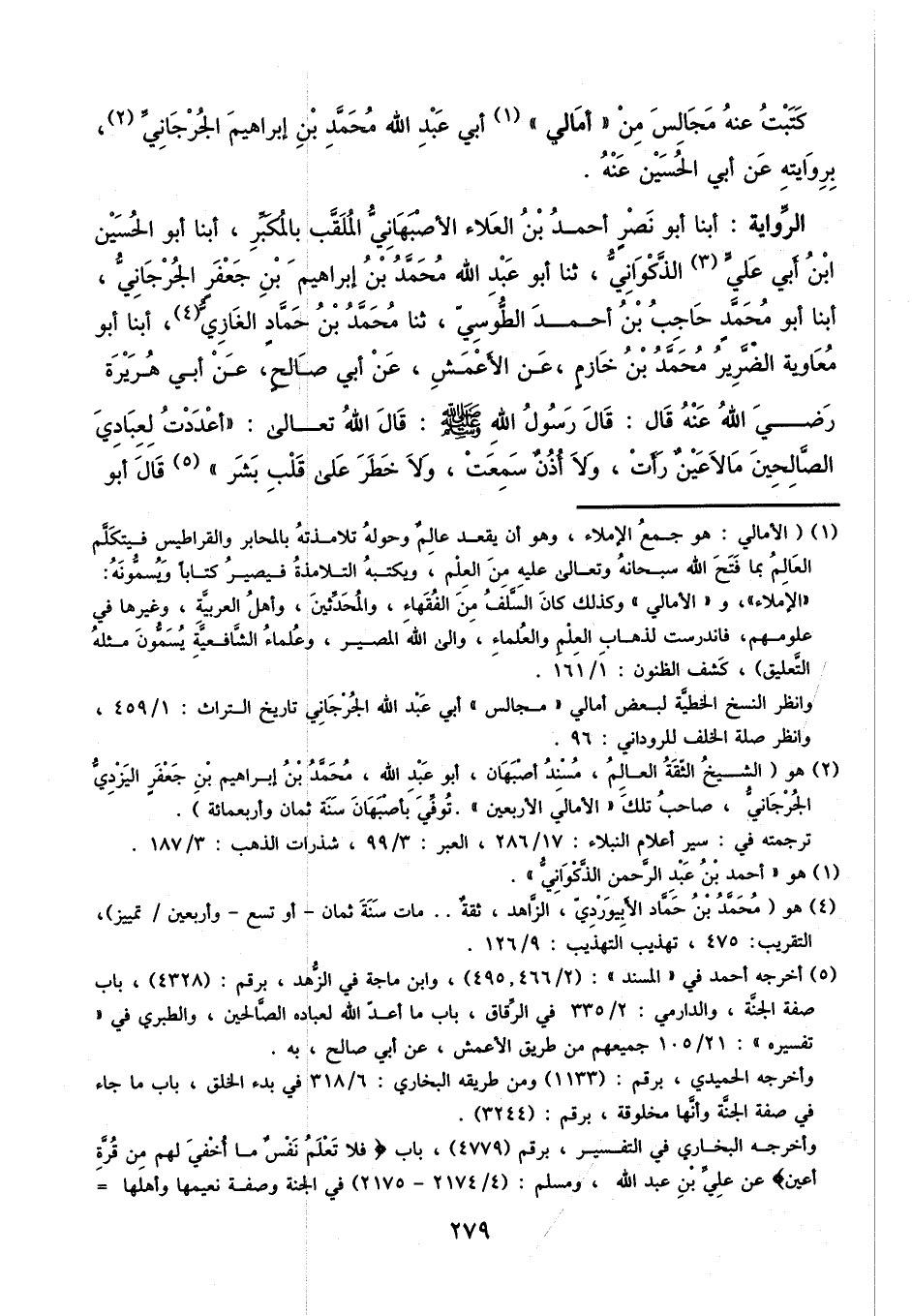 أبنا أَبُو نَصْرٍ أَحْمَدُ بْنُ الْعَلاءِ الأَصْبَهَانِيُّ، الْمُلَقَّبُ بِالْمُكَبِّرِ، أَبْنَا أَبُو الْحُسَيْنِ بْنُ أَبِي عَلِيٍّ الذَّكْوَانِيُّ، ثَنَا أَبُو عَبْدِ اللَّهِ مُحَمَّدُ بْنُ إِبْرَاهِيمَ بْنِ جَعْفَرٍ الْجُرْجَانِيُّ، أبنا أَبُو مُحَمَّدٍ حَاجِبُ بْنُ أَحْمَدَ الطُّوسِيُّ، ثنا مُحَمَّدُ بْنُ حَمَّادٍ الْغَازِيُّ، أبنا أَبُو مُعَاوِيَةَ الضَّرِيرُ مُحَمَّدُ بْنُ خَازِمٍ، عَنِ الأَعْمَشِ، عَنْ أَبِي صَالِحٍ، عَنْ أَبِي هُرَيْرَةَ، رَضِيَ اللَّهُ عَنْهُ، قَالَ: قَالَ رَسُولُ اللَّهِ، صَلَّى اللَّهُ عَلَيْهِ وَسَلَّمَ: قَالَ اللَّهُ تَعَالَى «أَعْدَدْتُ لِعِبَادِيَ الصَّالِحِينَ، مَا لا عَيْنٌ رَأَتْ، وَلا أُذُنٌ سَمِعَتْ، وَلا خَطَرَ عَلَى قَلْبِ بَشَرٍ» قَالَ أَبُو