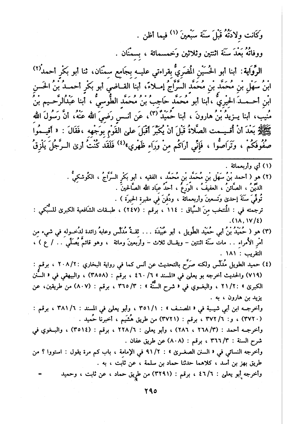أبنا أَبُو الْحُسَيْنِ الْمُضَرِيُّ، بِقِرَاءَتِي عَلَيْهِ بِجَامِعِ سِمْنَانَ، ثنا أَبُو بَكْرٍ أَحْمَدُ بْنُ سَهْلِ بْنِ مُحَمَّدٍ السَّرَّاجُ إِمْلاءً، أبنا الْقَاضِي أَبُو بَكْرٍ أَحْمَدُ بْنُ الْحَسَنِ بْنِ أَحْمَدَ الْحِيرِيُّ، أبنا أَبُو مُحَمَّدٍ حَاجِبُ بْنُ مُحَمَّدٍ الطُّوسِيُّ، أبنا عَبْدُ الرَّحِيمِ بْنُ مُنِيبٍ، أَبْنَا يَزِيدُ بْنُ هَارُونَ، أبَنَا حُمَيْدٌ، عَنْ أَنَسٍ، رَضِيَ اللَّهُ عَنْهُ: " أَنَّ رَسُولَ اللَّهِ، صَلَّى اللَّهُ عَلَيْهِ وَسَلَّمَ، بَعْدَ أَنْ أُقِيمَتِ الصَّلاةُ، قَبْلَ أَنْ يُكَبِّرَ أَقْبَلَ عَلَى الْقَوْمِ بِوَجْهِهِ، فَقَالَ: أَقِيمُوا صُفُوفَكُمْ، وَتَرَاصُّوا، فَإِنِّي أَرَاكُمْ مِنْ وَرَاءِ ظَهْرِي، فَلَقَدْ كُنْتُ أَرَى الرَّجُلَ يَلْزِقُ