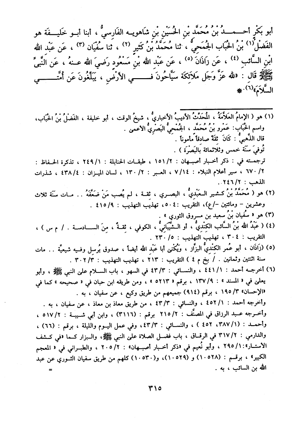 أَبُو بَكْرٍ أَحْمَدُ بْنُ مُحَمَّدِ بْنِ الْحُسَيْنِ بْنِ شَاهُوَيْهِ الْفَارِسِيُّ، أبنا أَبُو خَلِيفَةَ هُوَ الْفَضْلُ بْنُ الْحُبَابِ الْجُمَحِيُّ، ثنا مُحَمَّدُ بْنُ كَثِيرٍ، ثنا سُفْيَانُ، عَنْ عَبْدِ اللَّهِ بْنِ السَّائِبِ، عَنْ زَاذَانَ، عَنْ عَبْدِ اللَّهِ بْنِ مَسْعُودٍ، رَضِيَ اللَّهُ عَنْهُ، عَنِ النَّبِيِّ، صَلَّى اللَّهُ عَلَيْهِ وَسَلَّمَ، قَالَ: «لِلَّهِ، عَزَّ وَجَلَّ، مَلائِكَةٌ سَيَّاحُونَ فِي الأَرْضِ، يُبَلِّغُونِ عَنْ أُمَّتِي السَّلامَ»