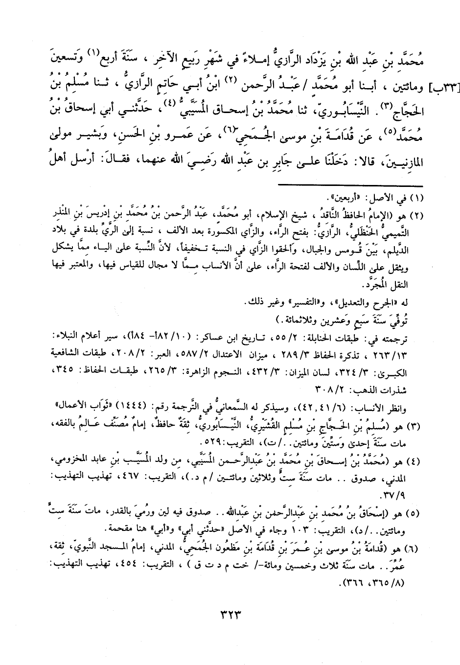 مُحَمَّدِ بْنِ عَبْدِ اللَّهِ بْنِ يَزْدَادَ الرَّازِيُّ إِمْلاءً فِي شَهْرِ رَبِيعٍ الآخِرِ سَنَةَ أَرْبَعٍ وَتِسْعِينَ وَمِائَتَيْنِ، أَبْنَا أَبُو مُحَمَّدِ عَبْدُ الرَّحْمَنِ بْنُ أَبِي حَاتِمٍ الرَّازِيُّ، ثنا مُسْلِمُ بْنُ الْحَجَّاجِ النَّيْسَابُورِيُّ، ثنا مُحَمَّدُ بْنُ إِسْحَاقَ الْمُسَيِّبِيُّ، حَدَّثَنِي أَبِي إِسْحَاقُ بْنُ مُحَمَّدٍ، عَنْ قُدَامَةَ بْنِ مُوسَى الْجُمَحِيُّ، عَنْ عَمْرِو بْنِ الْحَسَنِ، وَبَشِيرٍ، مَوْلَى الْمَازِنِيِّينَ، قَالا: دَخَلْنَا عَلَى جَابِرِ بْنِ عَبْدِ اللَّهِ، رَضِيَ اللَّهُ عَنْهُمَا، فَقَالَ: أَرْسَلَ أَهْلُ