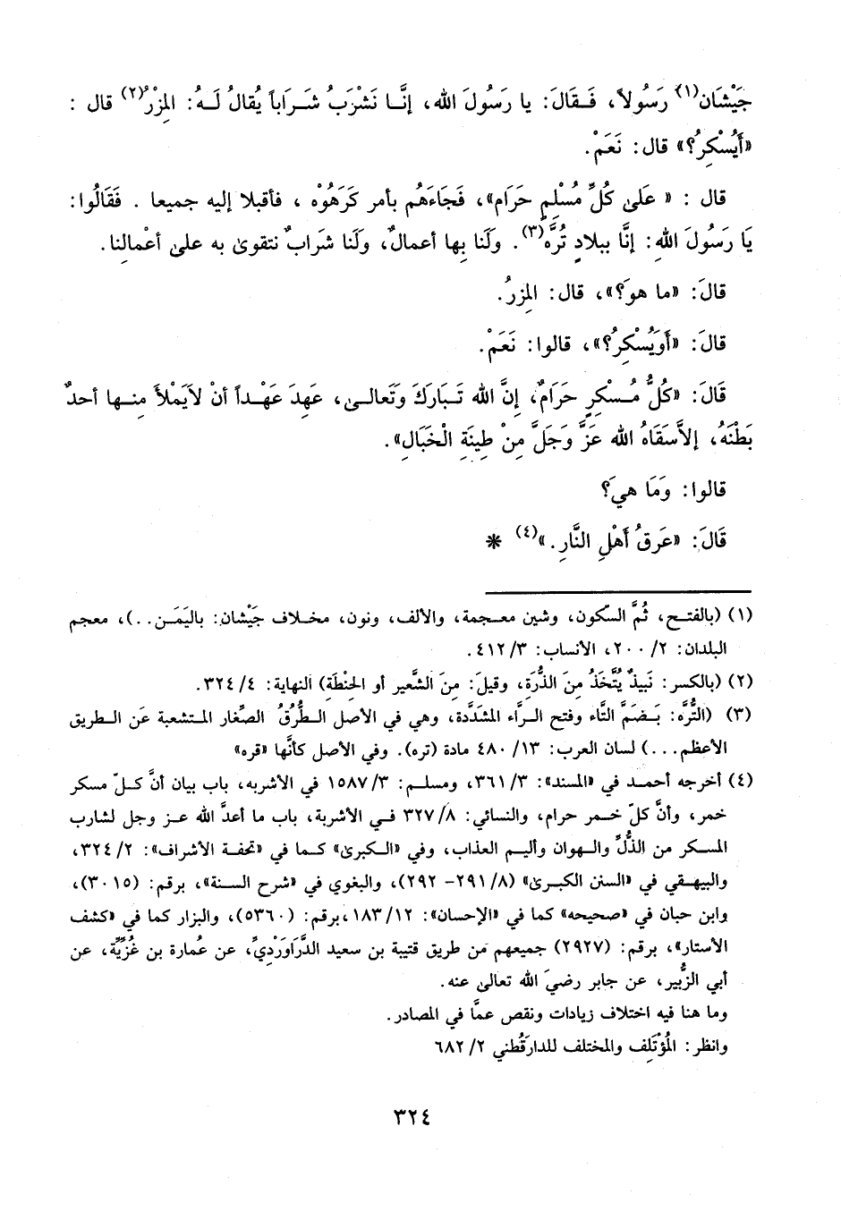 قَالَ: " كُلُّ مُسْكِرٍ حَرَامٌ، إِنَّ اللَّهَ، تَبَارَكَ وَتعَالَى عَهِدَ عَهْدًا أَنْ لا يَمْلأَ مِنْهَا أَحَدٌ بَطْنَهُ، إِلا سَقَاهُ اللَّهُ، عَزَّ وَجَلَّ، مِنْ طِينَةِ الْخَبَالِ، قَالُوا: وَمَا هِيَ؟ قَالَ: عَرَقُ أَهْلِ النَّارِ "