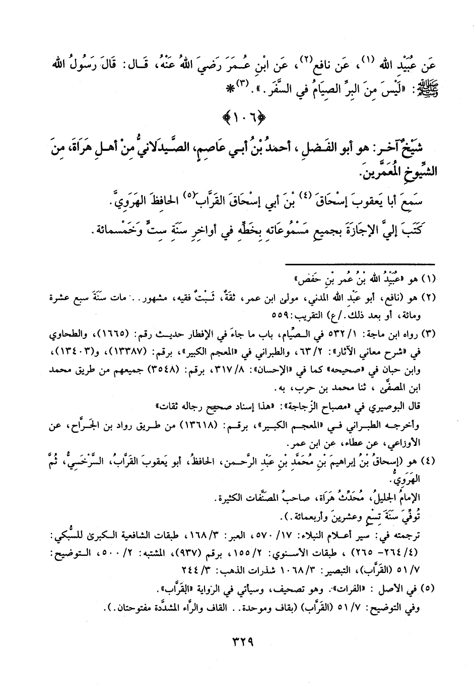 عَنْ عُبَيْدِ اللَّهِ، عَنْ نَافِعٍ، عَنِ ابْنِ عُمَرَ، رَضِيَ اللَّهُ عَنْهُ، قَالَ: قَالَ رَسُولُ اللَّهِ، صَلَّى اللَّهُ عَلَيْهِ وَسَلَّمَ: «لَيْسَ مِنَ الْبِرِّ الصِّيَامُ فِي السَّفَرِ»