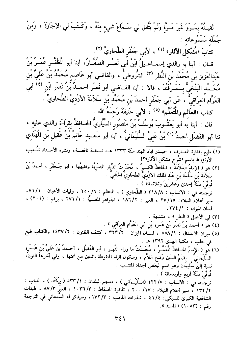قال: أبنا به والدي إسماعيل بن أبي نصر الصفار، أبنا أبو المظفر عمر بن عبد العزيز بن محمد بن النظر الشروطي، والقاضي أبو عاصم محمد بن علي بن محمد البلخي بسمرقند، قالا: أبنا القاضي أبو نصر أحمد بن أبي العوام العراقي، عن أبي جعفر أحمد بن محمد بن سلامة الأزدي الطحاوي.