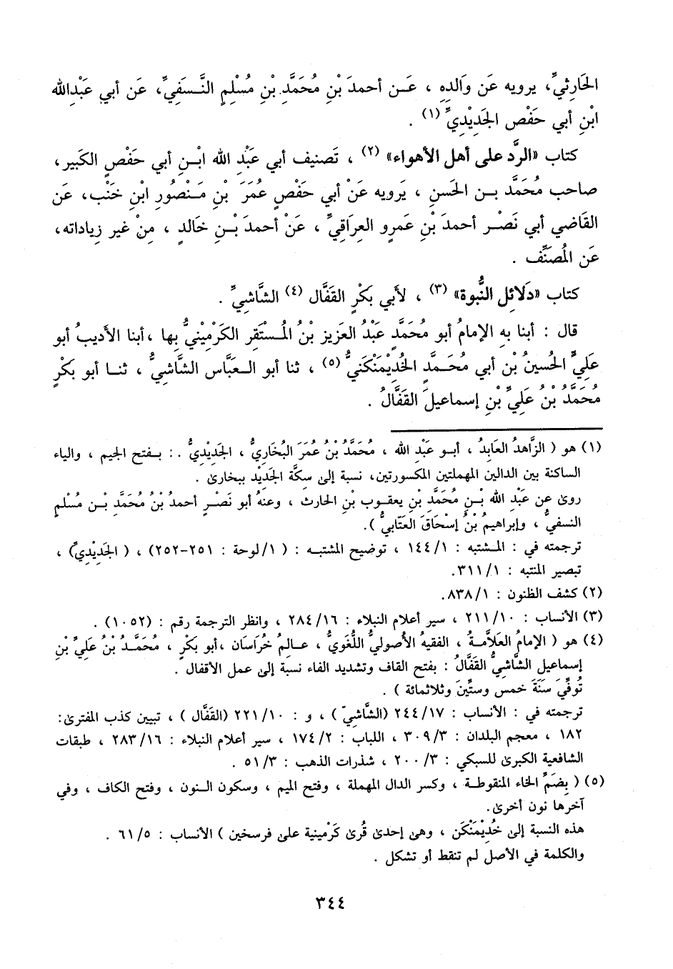 قال: أبنا به الإمام أبو محمد عبد العزيز بن المستقر الكرميني بها، أبنا الأديب أبو علي الحسين بن أبي محمد الخديمنكني، ثنا أبو العباس الشاشي، ثنا أبو بكر محمد بن علي بن إسماعيل القفال.