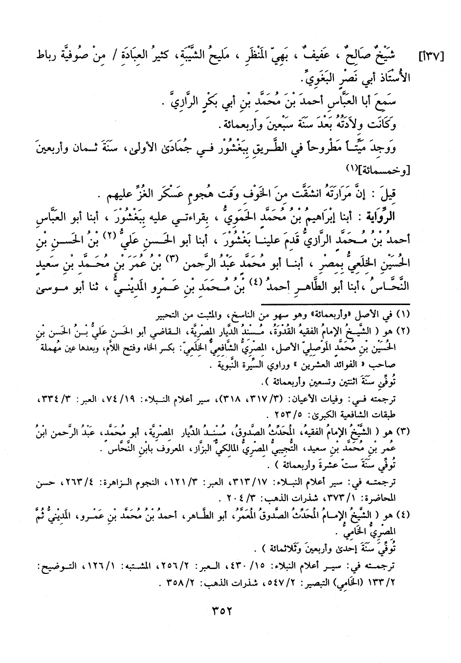 شيخ صالح، عفيف، بهي المنظر، مليح الشيبة، كثير العبادة، من صوفية رباط الأستاذ أبي نصر البغوي.