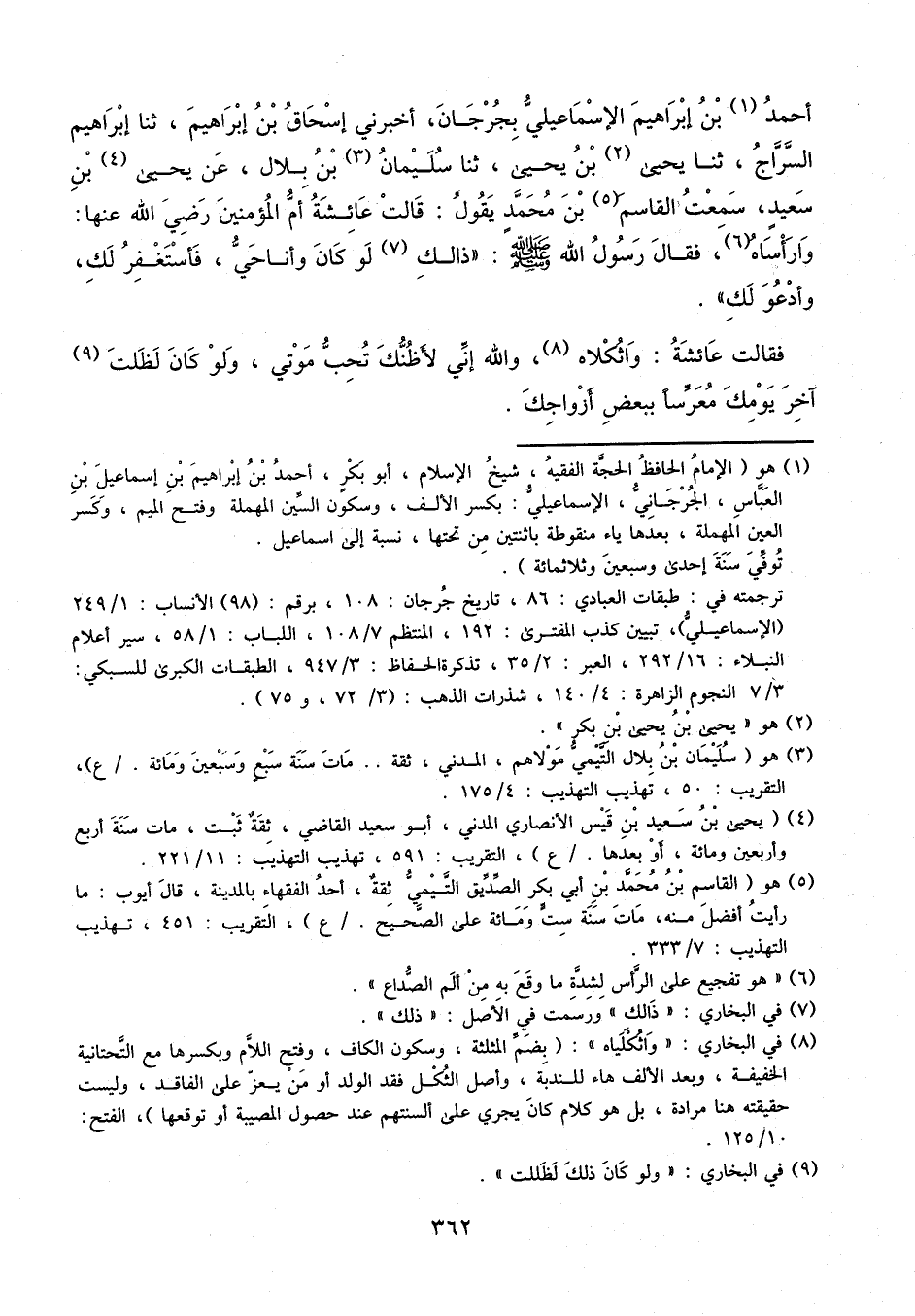 أَحْمَدُ بْنُ إِبْرَاهِيمَ الإِسْمَاعِيلِيُّ بِجُرْجَانَ، أَخْبَرَنِي إِسْحَاقُ بْنُ إِبْرَاهِيمَ، ثنا إِبْرَاهِيمُ السَّرَّاجُ، ثَنَا يَحْيَى بْنُ يَحْيَى، ثَنَا سُلَيْمَانُ بْنُ بِلالٍ، عَنْ يَحْيَى بْنِ سَعِيدٍ: سَمِعْتُ الْقَاسِمَ بْنَ مُحَمَّدٍ، يَقُولُ: قَالَتْ عَائِشَةُ، أُمُّ الْمُؤْمِنِينَ، رَضِيَ اللَّهُ عَنْهَا: وَا رَأْسَاهُ، فَقَالَ رَسُولُ اللَّهِ، صَلَّى اللَّهُ عَلَيْهِ وَسَلَّمَ: «ذَلِكَ لَوْ كَانَ وَأَنَا حَيٌّ فَأَسْتَغْفِرَ لَكِ وَأَدْعُوَ لَكِ» ، فَقَالَتْ عَائِشَةُ: وَا ثُكْلاهُ، وَاللَّهِ إِنِّي لأَظُنُّكَ تُحِبُّ مَوْتِي وَلَوْ كَانَ لَظلت آخِرَ يَوْمِكَ مُعَرِّسًا بِبَعْضِ أَزْوَاجِكَ،