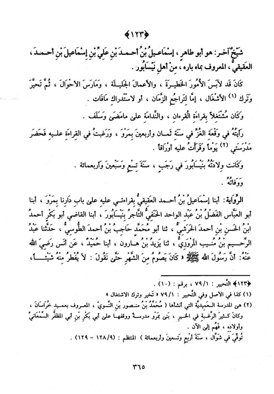 شيخ آخر: هو أبو طاهر إسماعيل بن أحمد بن علي بن إسماعيل بن أحمد العقيقي، المعروف بماه باره، من أهل نيسابور.